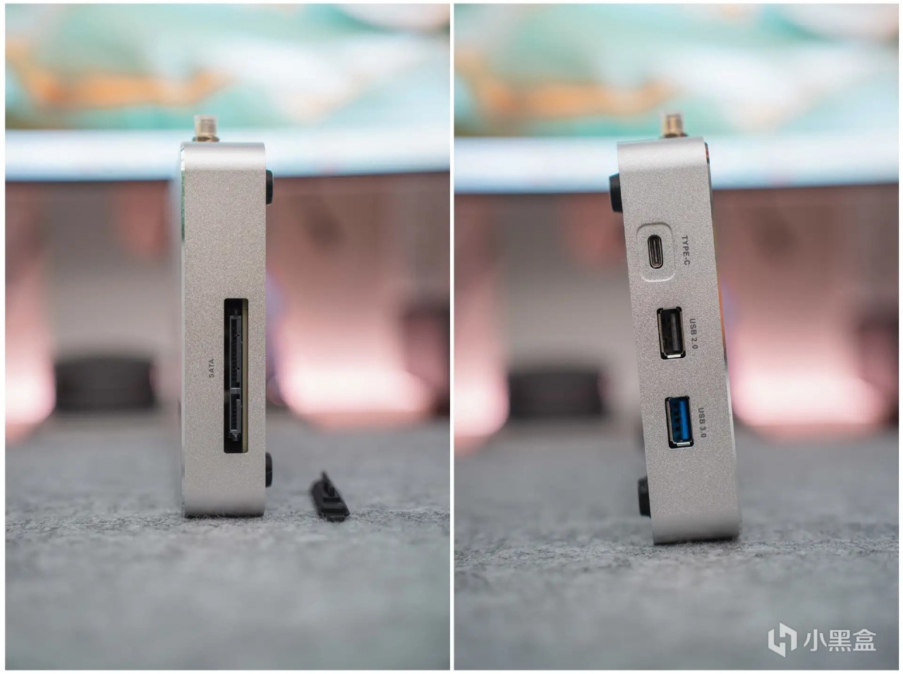 ▼机身右侧 USB 2.0 * 1、USB3.0 * 1、TYPE-C * 1 ,右侧则是 SATA 外置硬盘接口,可以连接硬盘读取数据。应该说设备的兼容性还是比较丰富的,不过对我这样的 NAS 玩家直接可以无视。