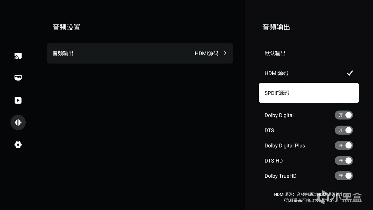 ▼海美迪 Q5 六代支持硬解 Dolby digital plus 杜比音效、并支持所有Dolby audio(Dolby Atmos、Dolby tureHD、Dolby digital plus、Dolby AC3)和 DTS(DTS-X、DTS-HD、DTS)全格式源码透传输出。如果有独立功放建议单独连接,并在系统设置中选择对应输出