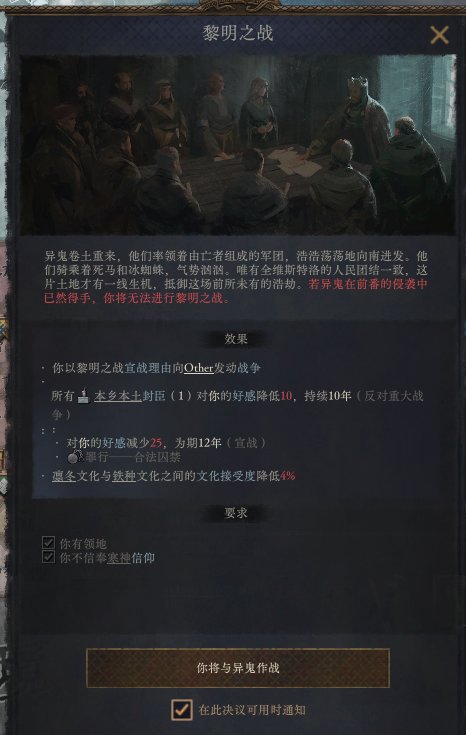在異鬼攻陷絕境長城後(大概?),與之相鄰的統治者將可以發動【黎明之戰】討伐異鬼,戰勝後將根據規則設置