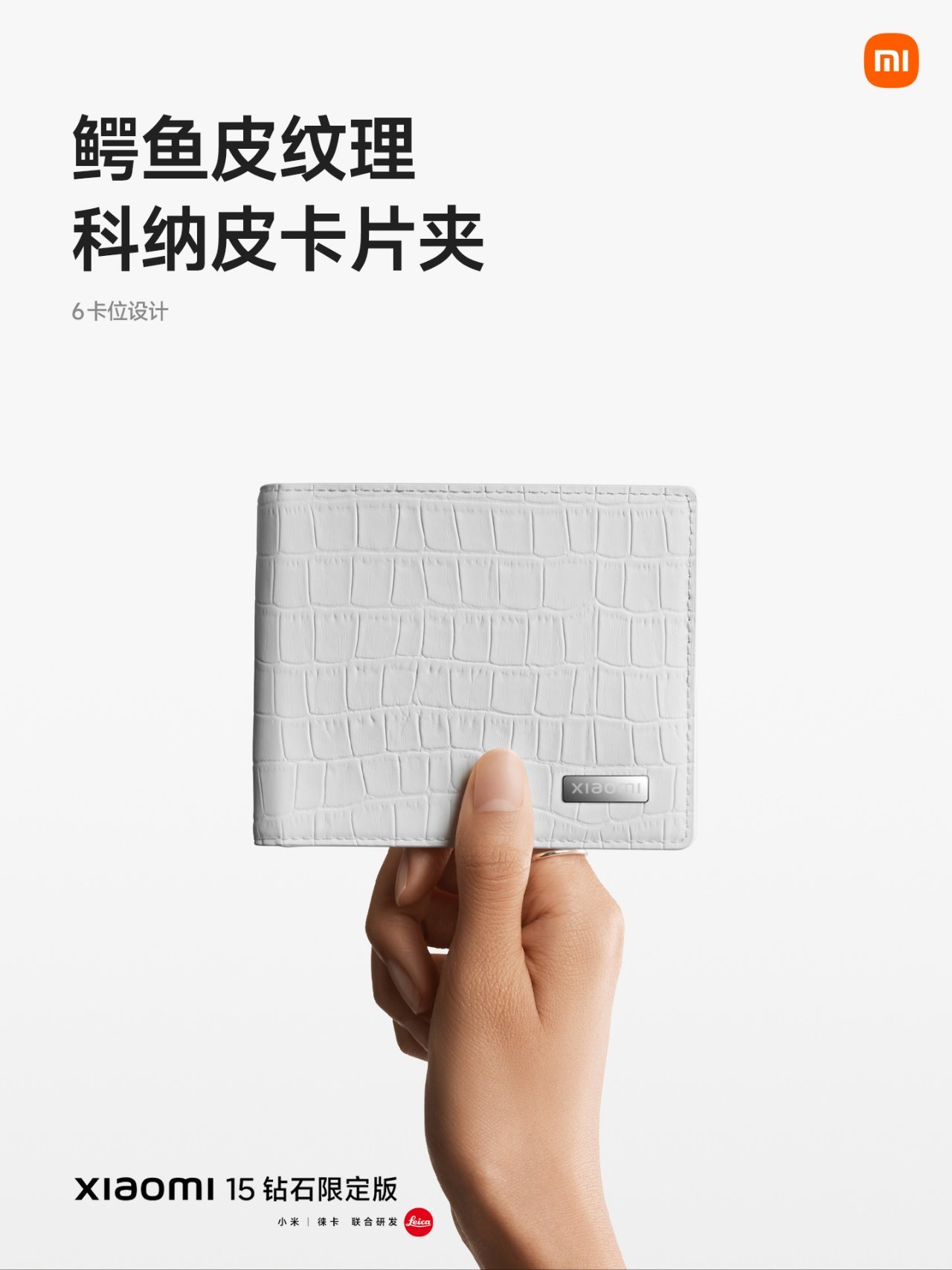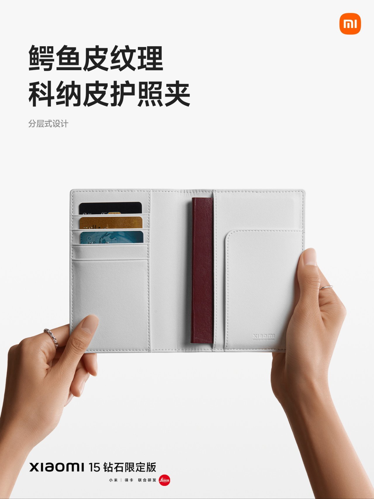 除了手機本身,小米15鑽石限定版的定製禮盒也充滿了驚喜。禮盒內除了手機外,還配備了定製“鱷魚皮紋理科納皮”卡片夾和護照夾。