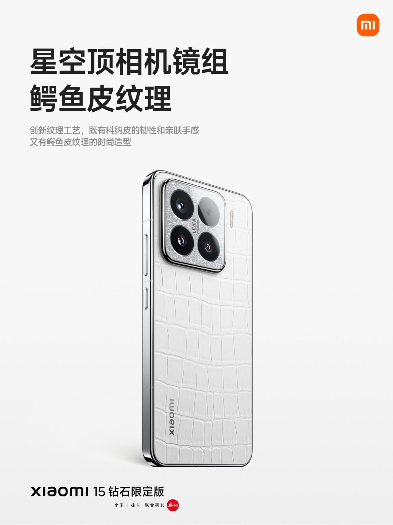 在設計上,小米15鑽石限定版採用了鑽石鑲嵌中框設計,每一顆鑽石都經過精心挑選和鑲嵌,閃爍着璀璨的光芒。同時,手機背板採用了鱷魚皮紋理科納皮材質,這種材質不僅觸感舒適,更彰顯出手機的奢華質感。