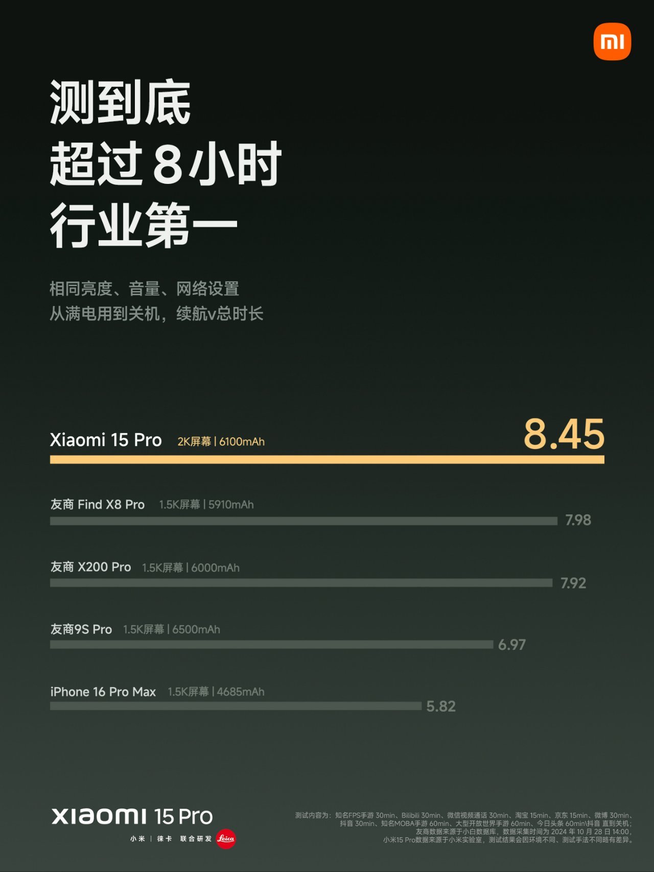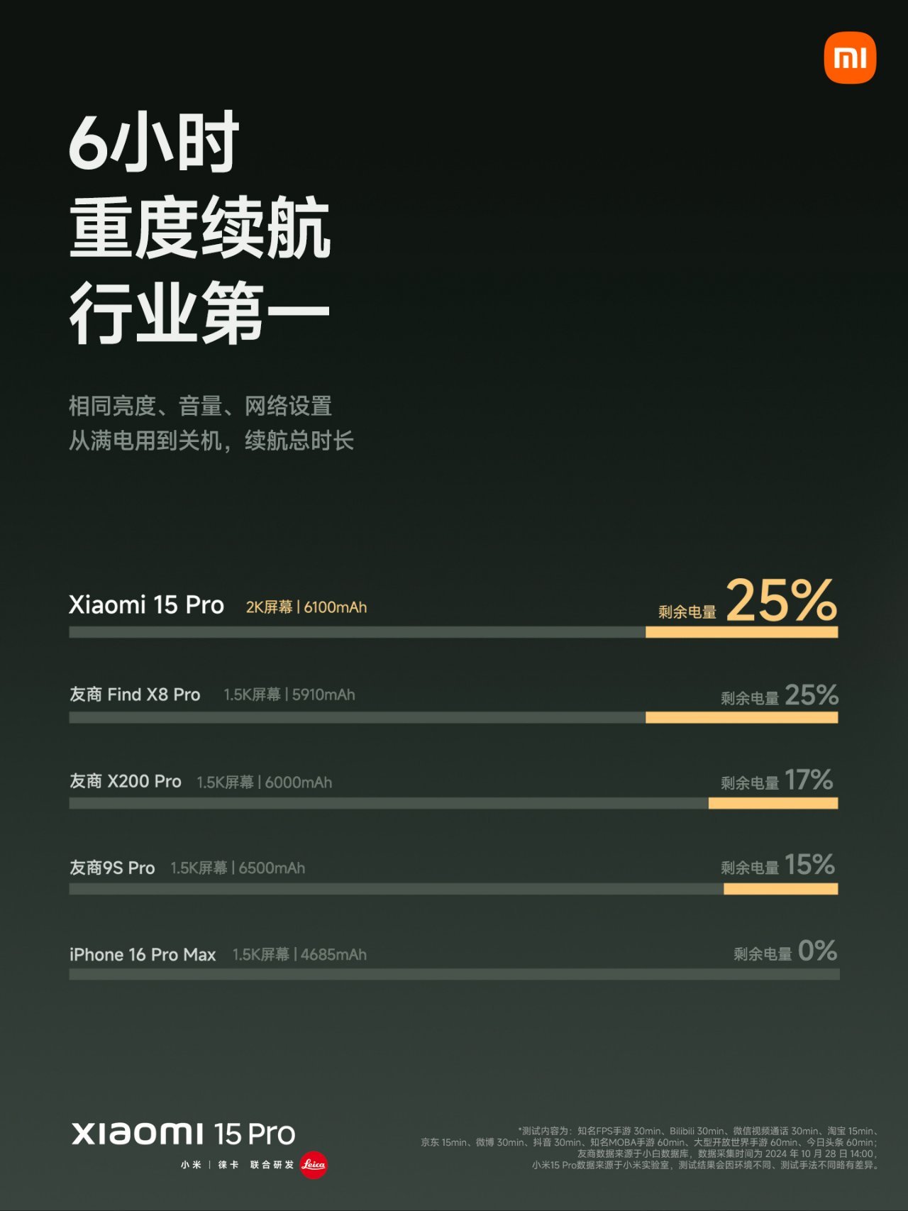 續航方面,小米15 Pro搭載了澎湃P3快充芯片和澎湃G1電池管理芯片,內置6100mAh的金沙江電池。這款電池採用了正極4.53V高電壓鈷酸鋰材料、負極6%硅含量+碳納米管導電網絡等技術,使得能量密度達到了850Wh/L。