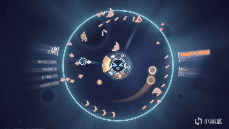 Demo发布之前,我先来简单介绍一下这个游戏,这是一个对操作要求不高的弹幕/塔防/类幸存者游戏,画面是一个〇(我做的上一个游戏,画面也是一个〇)