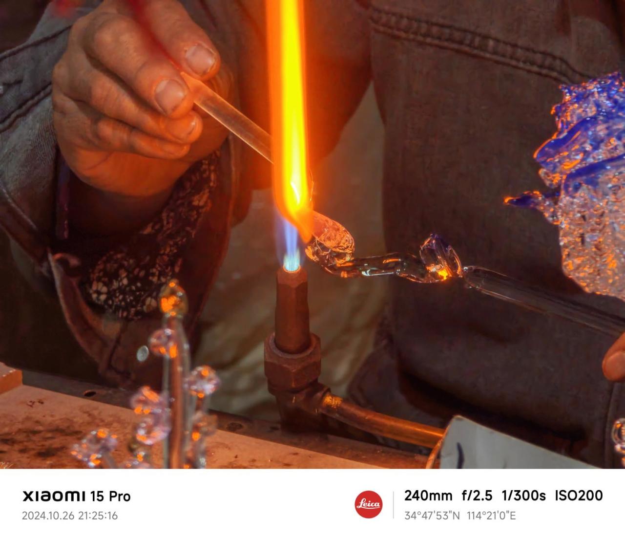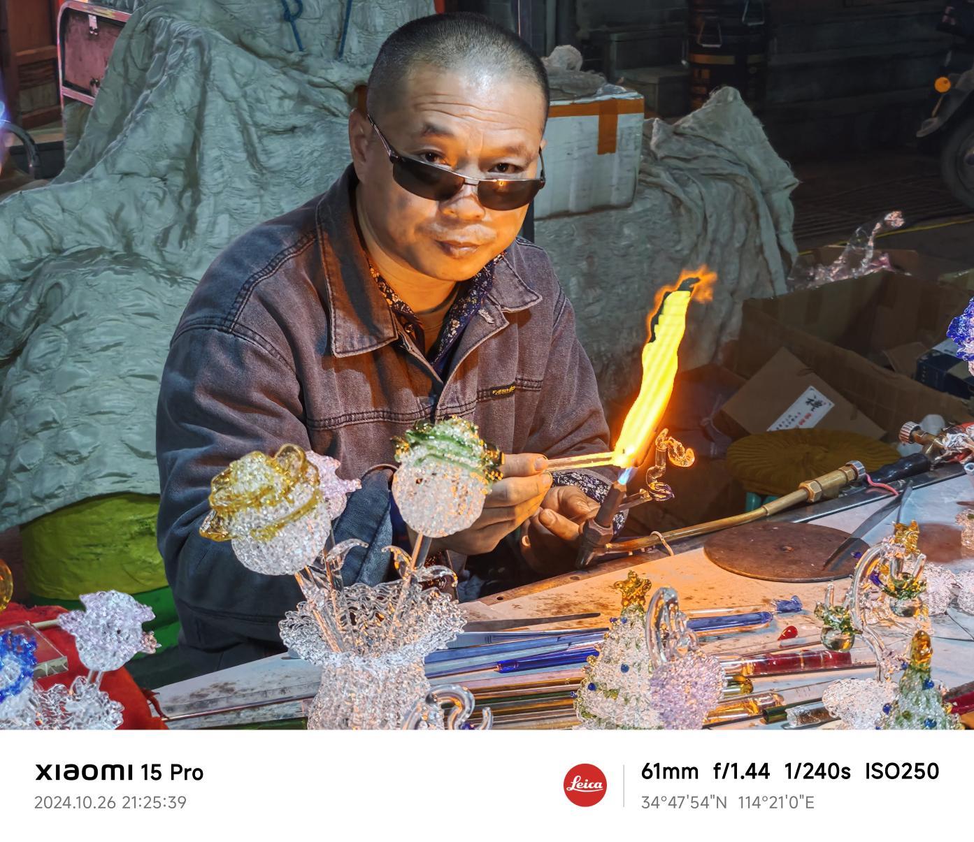 光线较暗的环境下,可以凸显出小米15 Pro主摄更大的进光量。下图拍摄了一位师傅正在用火焰煅烧玻璃,制作不同形状的玻璃装饰品。