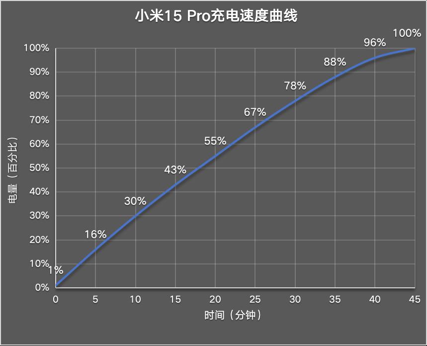此时为小米15 Pro充电,5分钟充电16%;10分钟充电30%;15分钟充电43%;20分钟充电55;25分钟充电67%;30分钟充电78%;35分钟充电88%;40分钟充电96%;45分钟充至满电。
