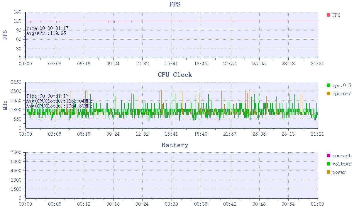虽然性能理论跑分低了些,但是其实际性能释放还是很强的。玩半小时最高画质120Hz《王者荣耀》,画面平均帧率119.95 FPS,几乎满帧。