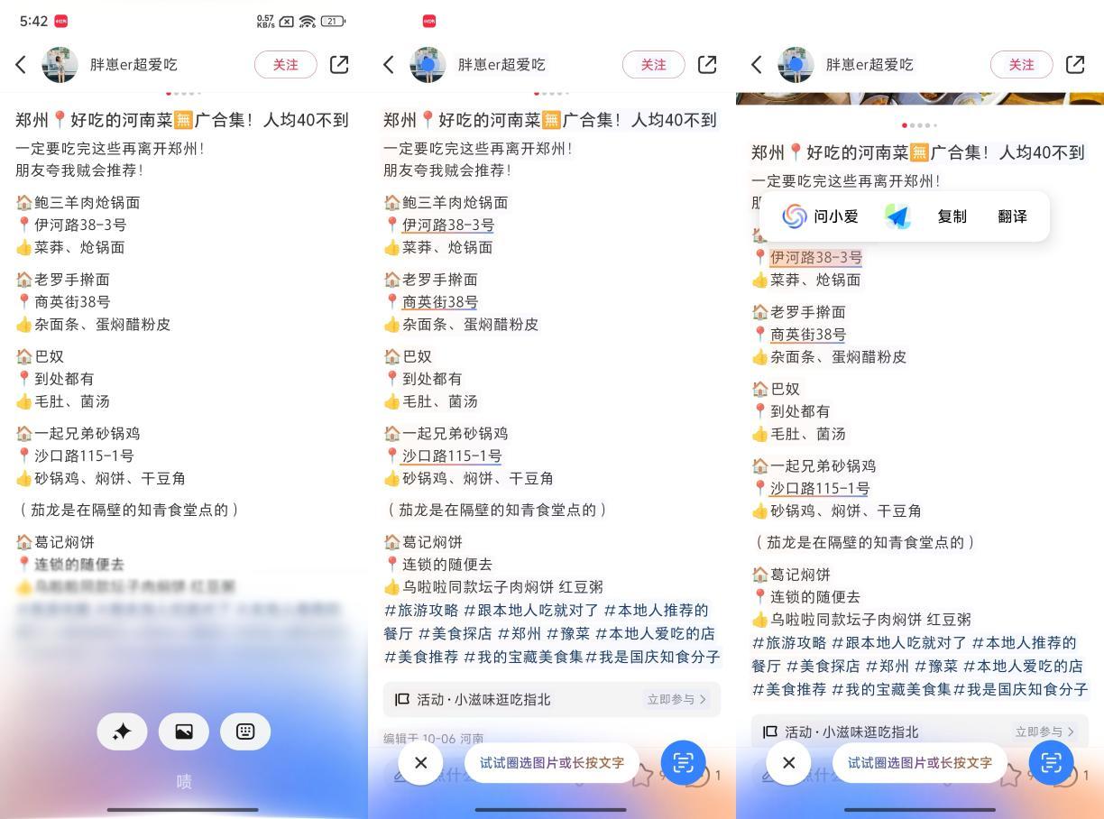 现在小爱同学增加了识屏功能,会对地址、图片、号码等信息进行自动批注。举个例子,查看美食推荐类相关笔记,小爱会自动识别出日记中的地址信息,点击即可自动跳转至高德地图,导航到对应的门店。