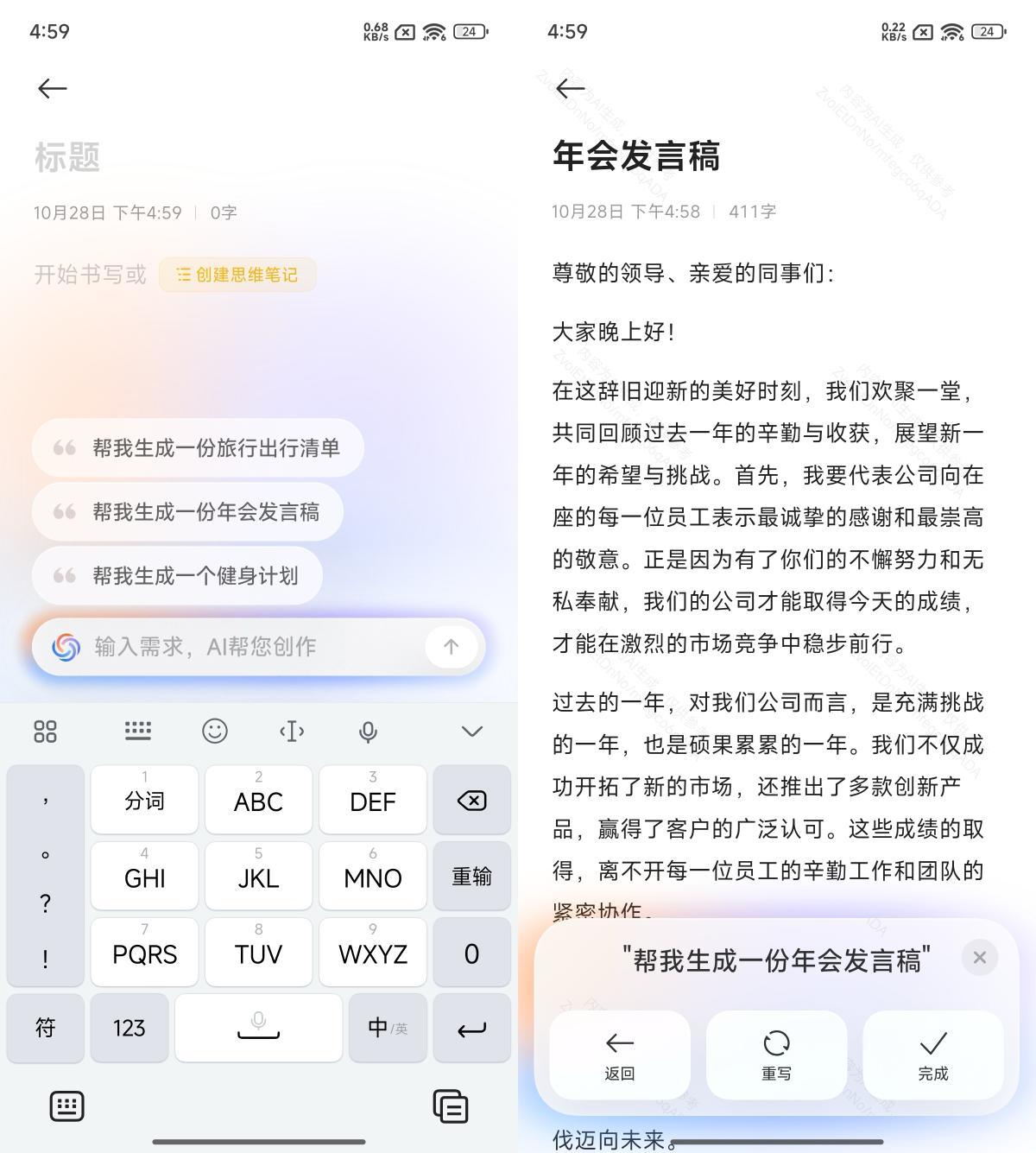 澎湃OS 2.0的笔记APP现在加入了AI写作功能,它不仅支持一句话生成文本,还支持一键文本改写。这对于语言表达能力较弱的用户来说,可以提升他们的工作效率,如果觉得第一次生成的文案不满意,还可以继续生成新的文案。