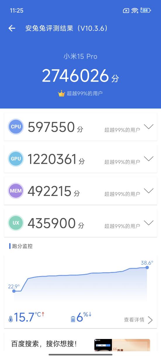 在安兔兔综合性能跑分中,小米15 Pro的表现不是太理想,可能是因为媒体评测机的缘故,系统还没有优化好,导致安兔兔最终成绩偏低,只有2746026分。