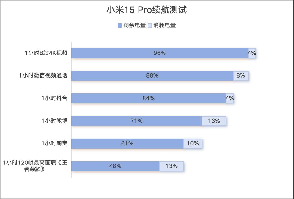 满电状态下,使用小米15 Pro播放1小时B站视频,耗电4%;1小时微信视频通话,耗电8%;1小时抖音,耗电4%;1小时微博耗电13%;1小时淘宝,耗电10%;1小时最高画质120帧《王者荣耀》,耗电13%。