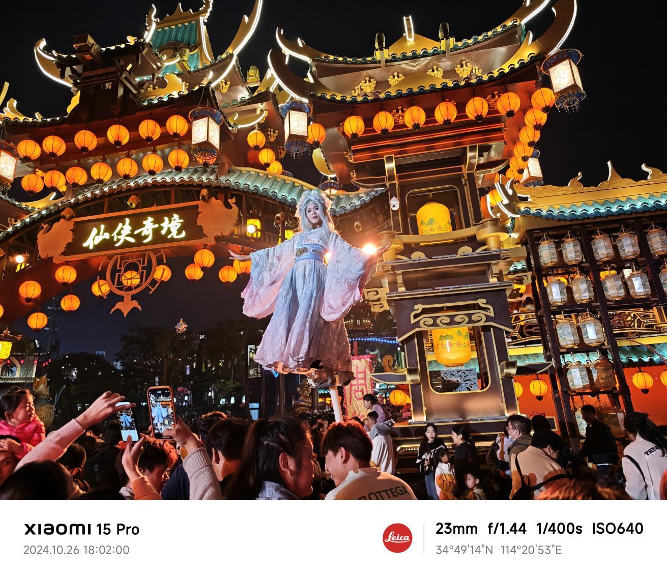 光线复杂的环境下,小米15 Pro的主摄依旧能打。照片左侧灯牌上的文字清晰可见,踩高跷的妹子后方的圆形灯发出的光,小米15 Pro也没有刻意去压制,照片放大数倍后,妹子面部表情和神态历历在目。