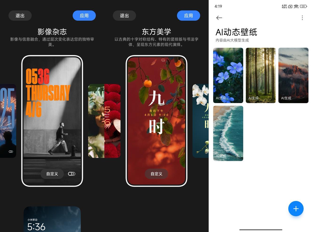 澎湃OS 2.0新增影像杂志、东方美学和AI动态壁纸。在锁屏状态下,手机可以实现动态景深效果。