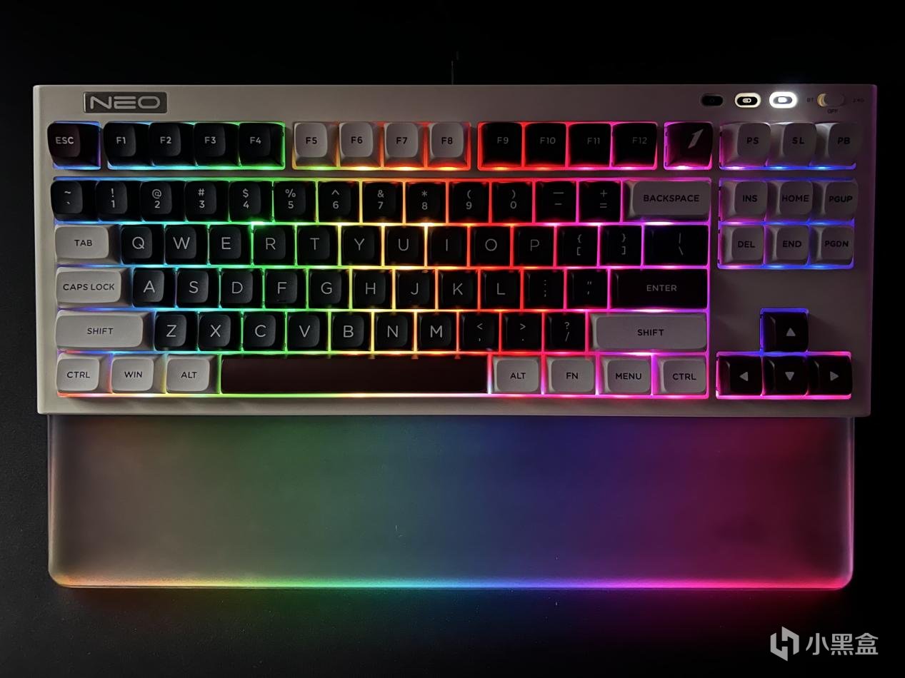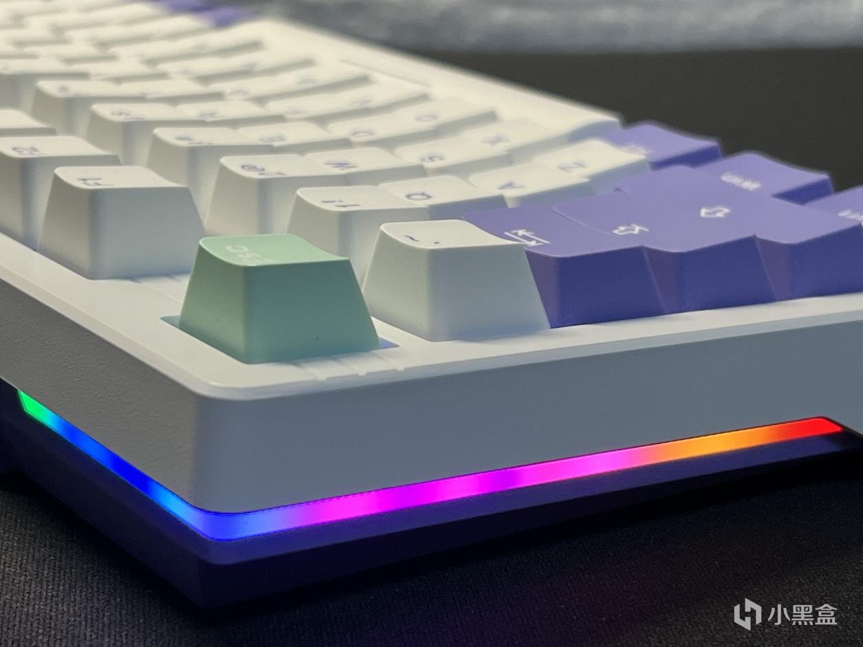 同時加上音量旋鈕,調節音量方便,還支持按壓暫停,平常聽歌也十分舒適,最重要的是鍵盤兩側還有燈帶,完全可以起到畫龍點睛的效果,放在桌子上電競氛圍拉滿,畢竟RGB攻擊力能+10嘛。