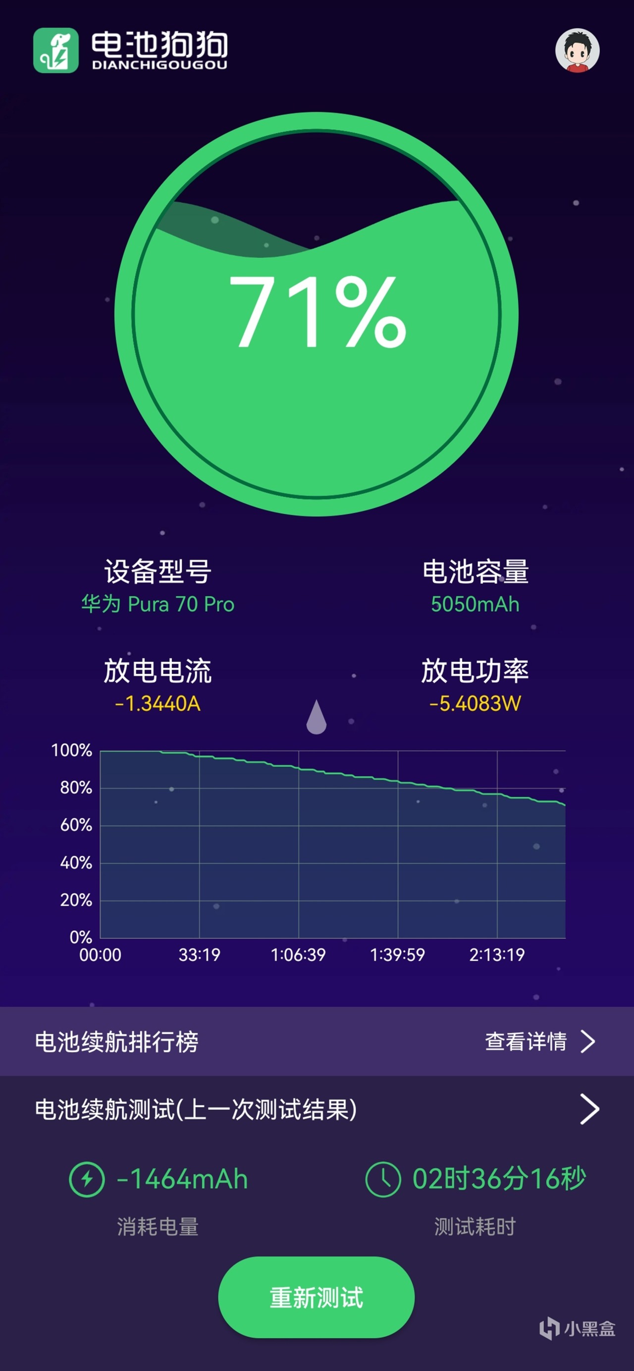 我用电池狗狗做了一下测试,模拟测试循环跑了好多好多遍,二个半小时多点才把电池从100%用到71%,这样算起来,华为Pura 70 Pro在满电的情况下能够坚持9个小时以上的连续使用,完全没有电量忧虑。