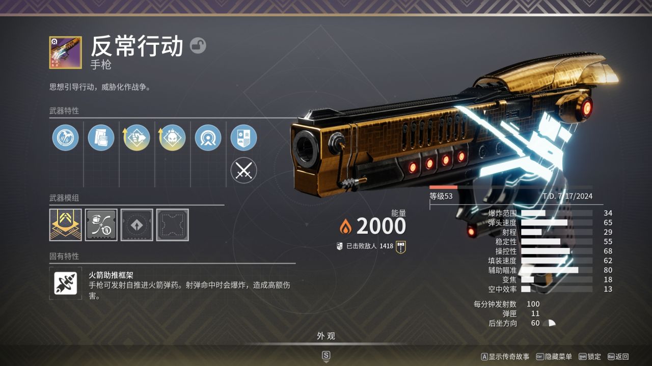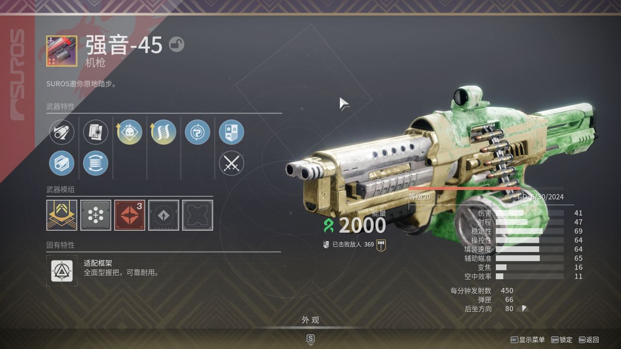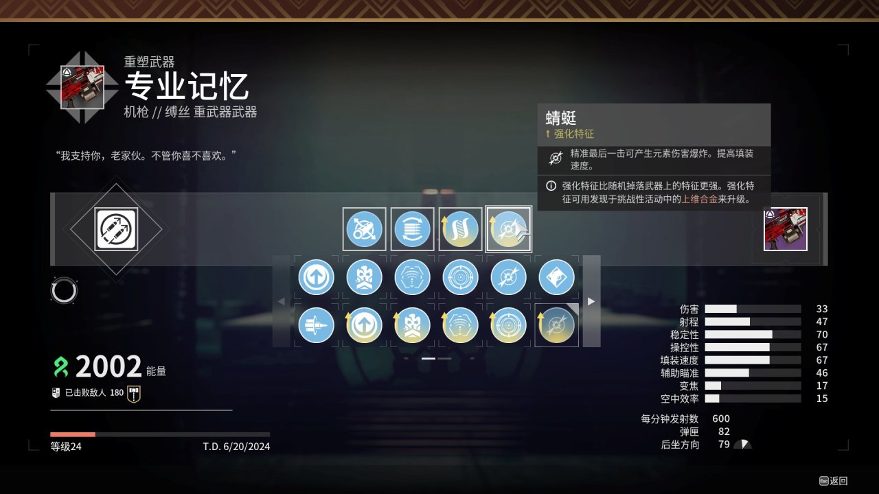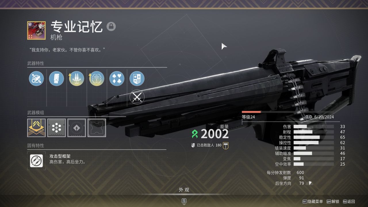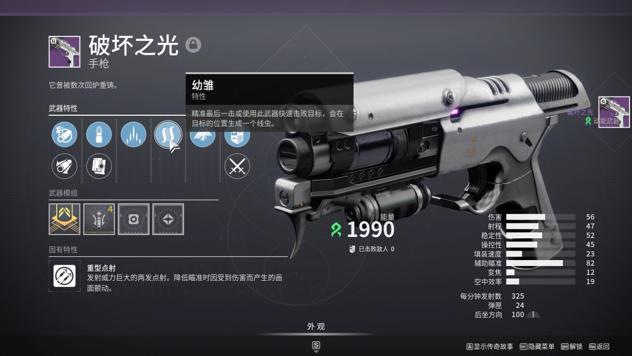 专业记忆:楼主这把是输出用的,这把武器也有幼雏和蜻蜓的清怪组合,可惜这样的组合就没有换弹perk了