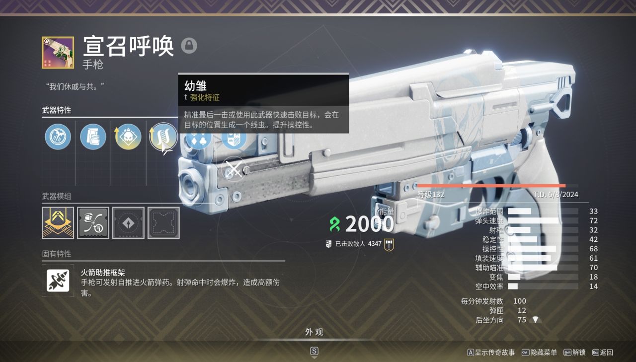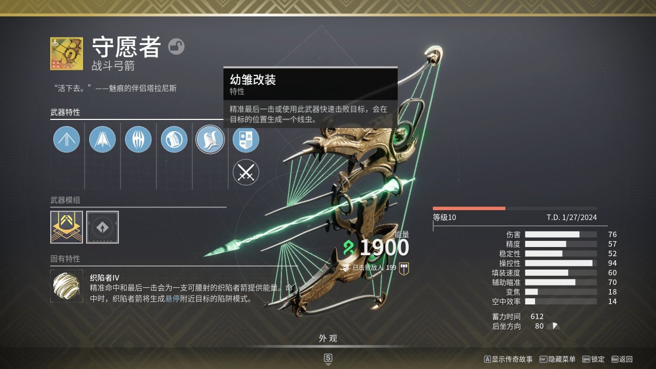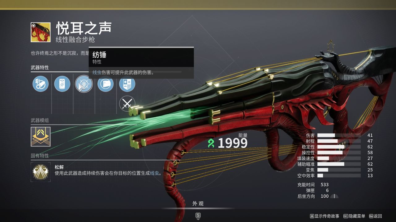这两把武器都拥有爆破专家+幼雏的perk。爆破专家在击杀单位后可恢复手雷能量,丢手雷可换弹。幼雏+重生丝线+编织者之唤在使用这些缚丝武器清怪的时候都有源源不断的虫虫。