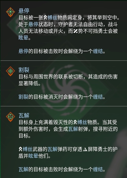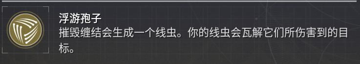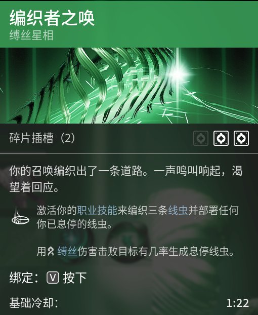 在看具体配装前,我们先了解了解缚丝术的一点点小细节。缚丝术——虫群织工,相比绿泰坦绿猎人,缚丝术士的线虫有一个比较特殊的性质:息停。