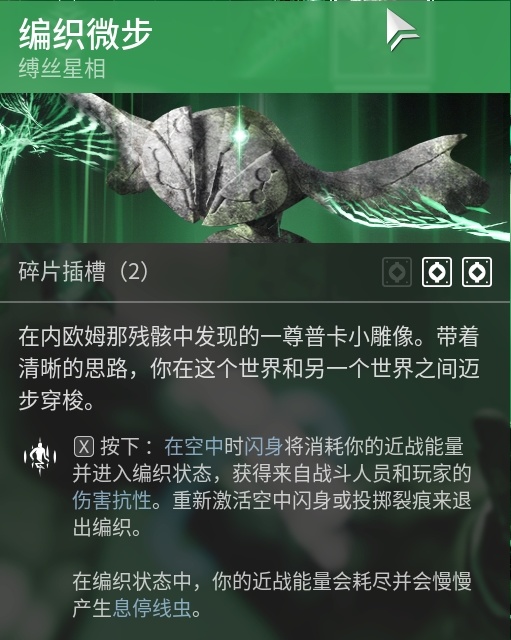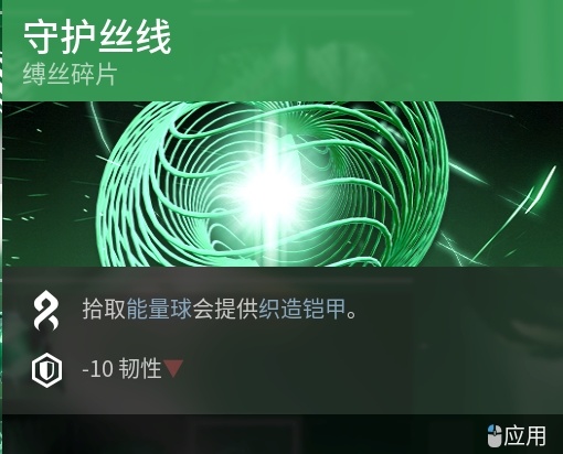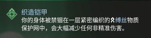 守护丝线:拾取能量球给予5s织造铠甲。在先前是10s的时候带上这个碎片性价比很高,但现在只持续5秒就不那么值。在编织微步也能提供高额减伤的情况下就酌情带吧。