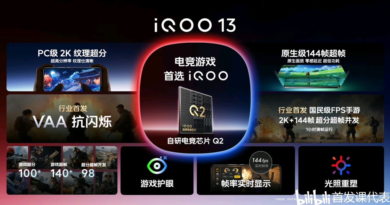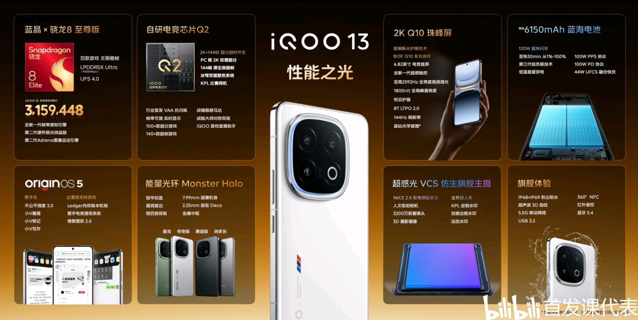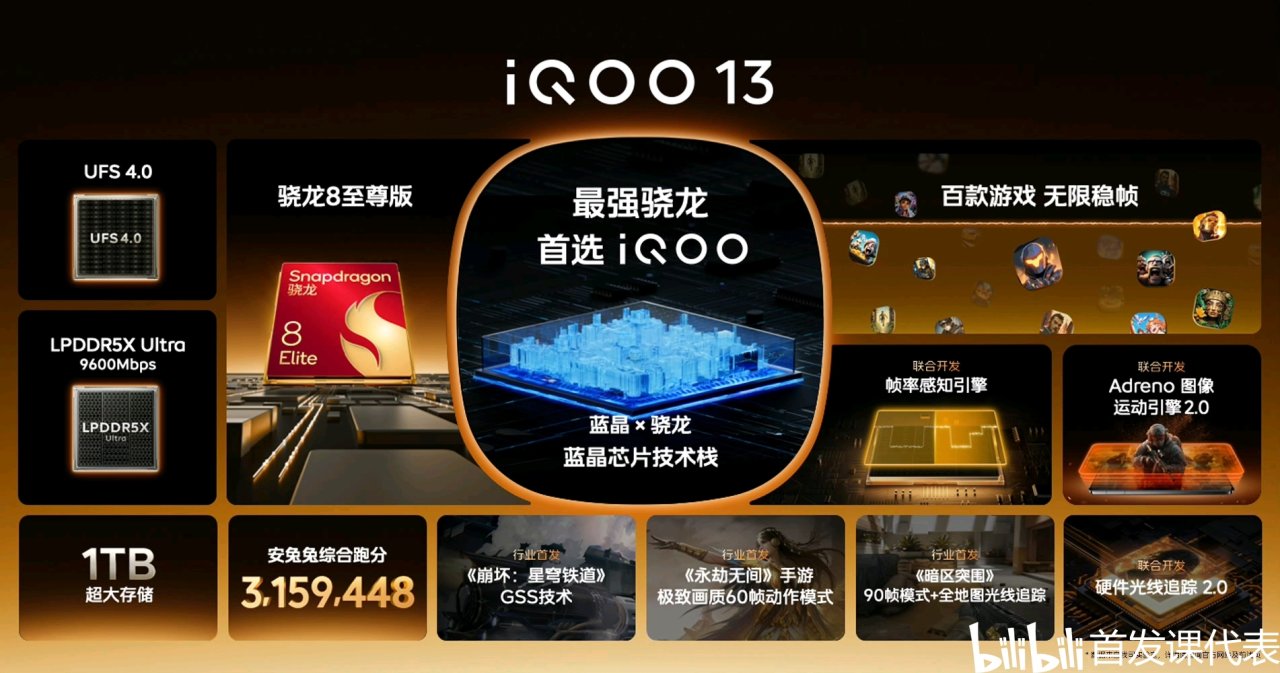 ◆ 芯片:骁龙 8 至尊版移动平台,配备LPDDR5X Ultra 内存(9600Mbps),UFS 4.0 闪存(标准更新后为 UFS 4.1),首发自研电竞芯片 Q2,7000mm² VC 均热板;