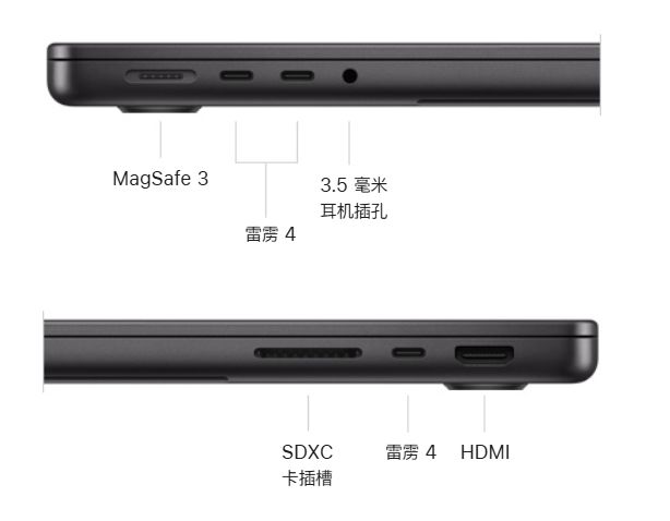 M4 Pro 和 M4 Max 机型配备 3 个雷雳 5 端口;