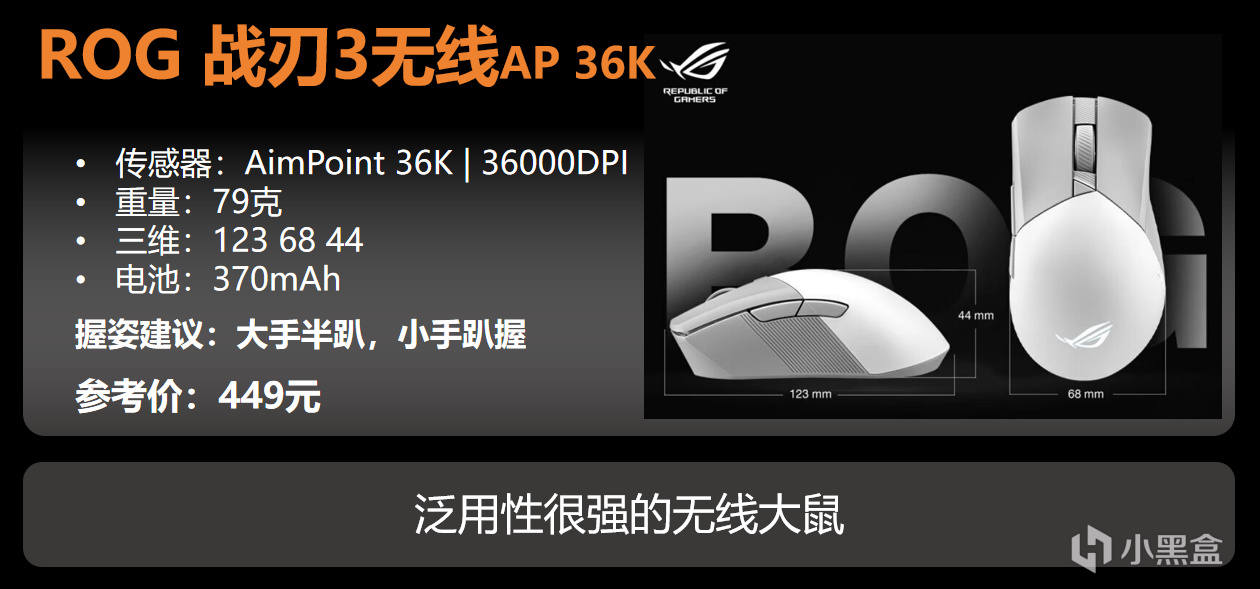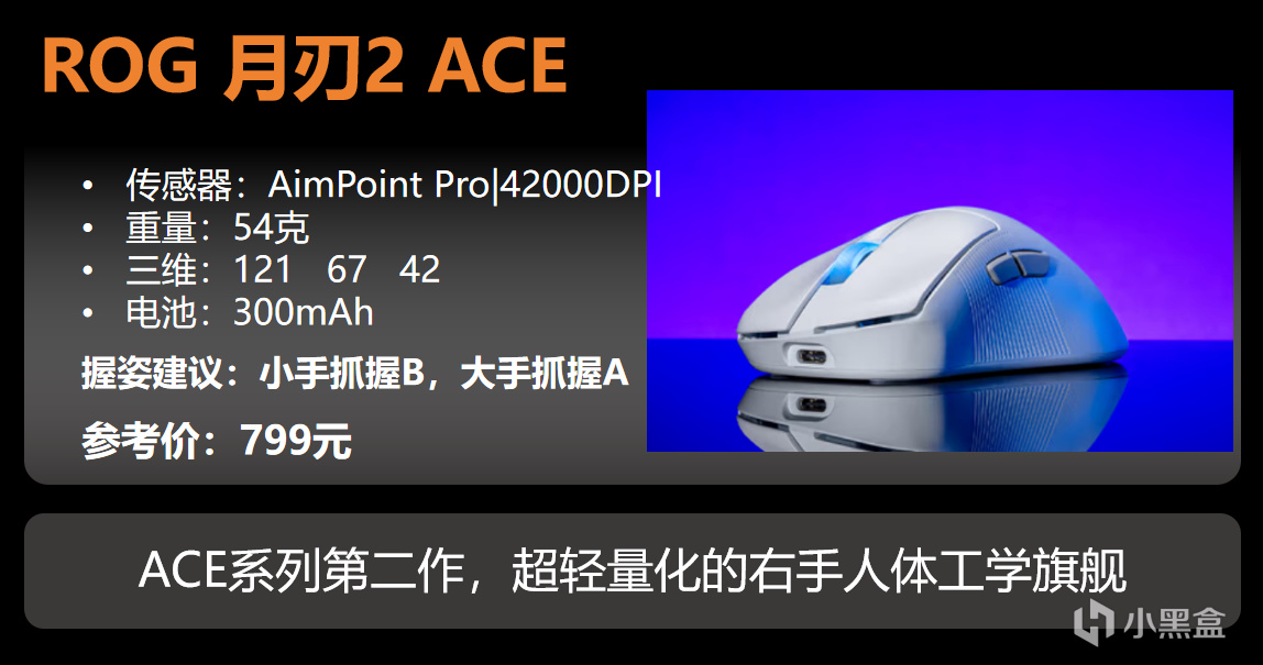 超轻量化;右手人体工学模具设计新高度;PA11尼龙材质不打油;ROG的光微动脆一点,手感不错,但是仍然是光微动那个手感;799元还是有点贵,可以等等到599元;不是很合适手腕流,大小手的抓握都合适手臂流