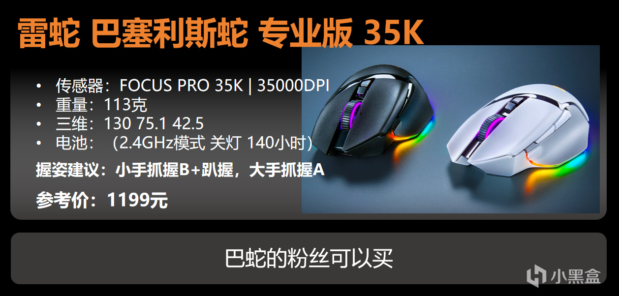 东西是好东西,在炼狱蝰蛇基础上做了缩小,对于之前用专业版不舒服和不习惯的佬爷们,在极速版做了非等比例缩小,手感舒服了不少,甚至直接终结了“炼狱蝰蛇模仿者”比赛。而且新加入的动态DPI效果确实很棒。