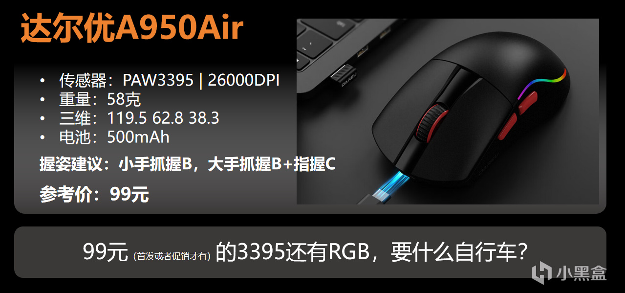 如果没啥重量要求,也可以考虑最便宜的A950Air。只要99元,就可以拿到3395传感器+500mAh电池以及华诺的某7000W次微动还有RGB灯光,甚至这tm是个三模的鼠标。
