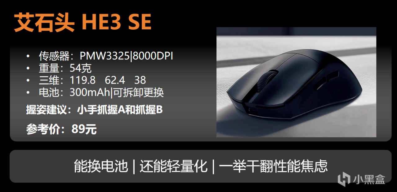 当然如果你愿意多花一倍的钱,可以考虑HE3 非SE版本,采用更好的微动和滚轮,8000万次的蓝壳粉点和TTC金轮,还有3395。看自己需求了。