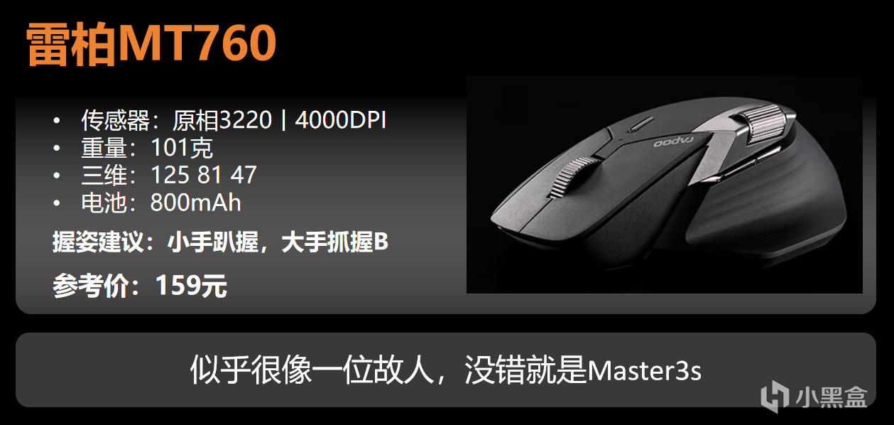 回到Master3s,如果你确实觉得自己的手心没啥支撑,又是办公环境,确实可以直接入Master3s。如果你不确定自己是否合适,咱建议考虑前面的雷柏MT760先试试。如果你发现MT760不能满足你了,这时候再换Master3s也不是不行。