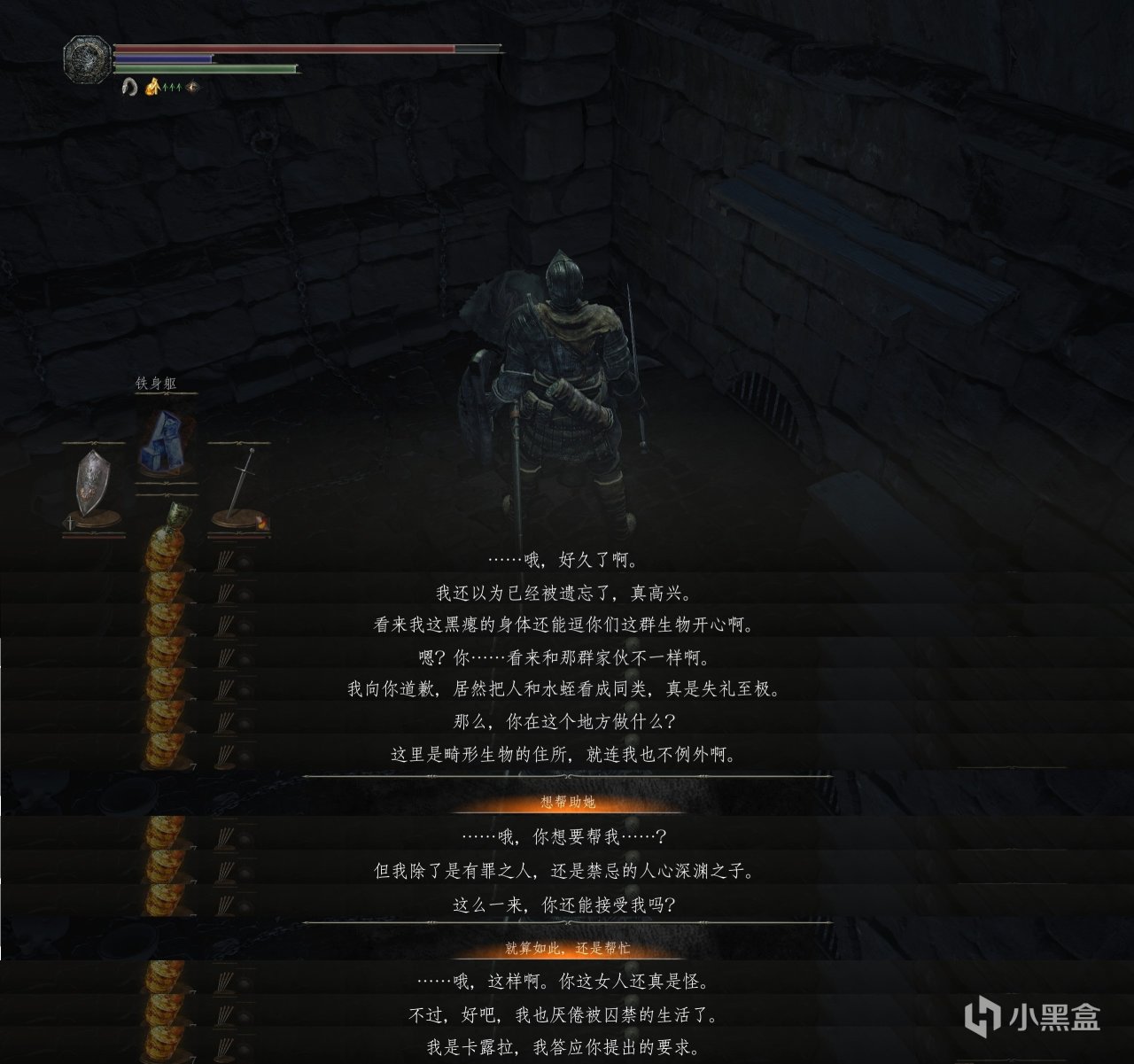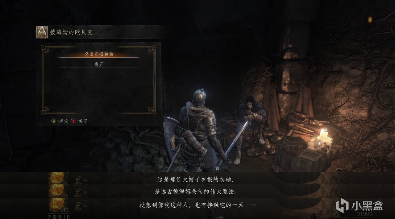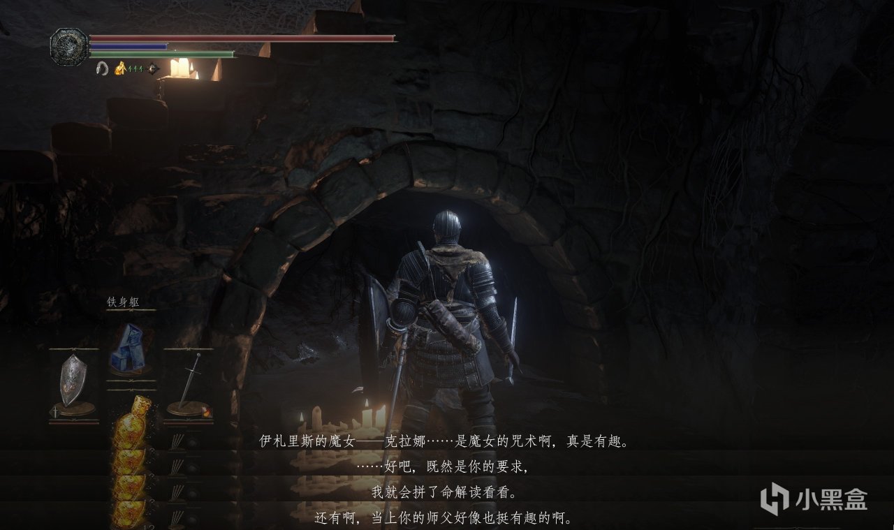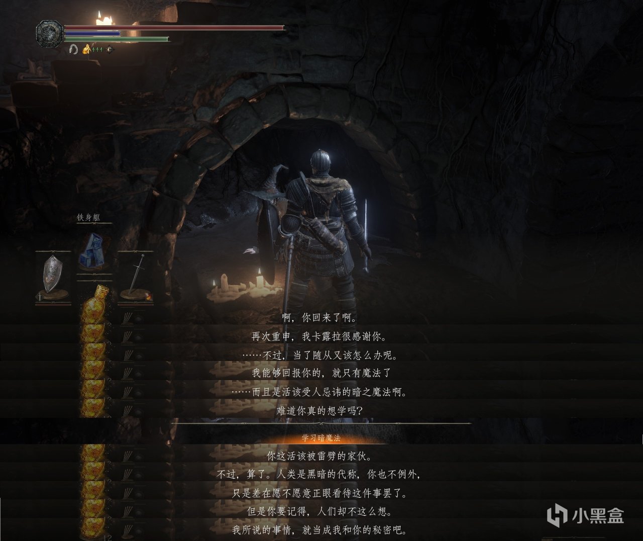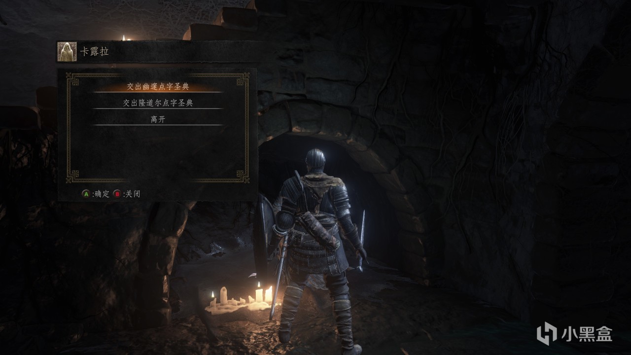 找魔女卡露拉(這個魔女的稱呼指不是亞瓦套上的魔女佳麗,而是來自魂1的稱呼,代指非學院出身的野路子女法師,說好聽點叫異端魔法師,不過這也是個蔑稱,加上卡露拉是暗之墮子,天生低人一等,所以用魔女稱呼也是有歧視意味)