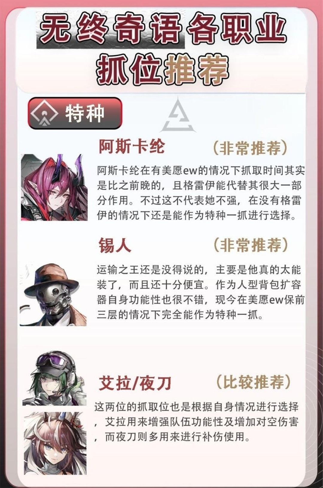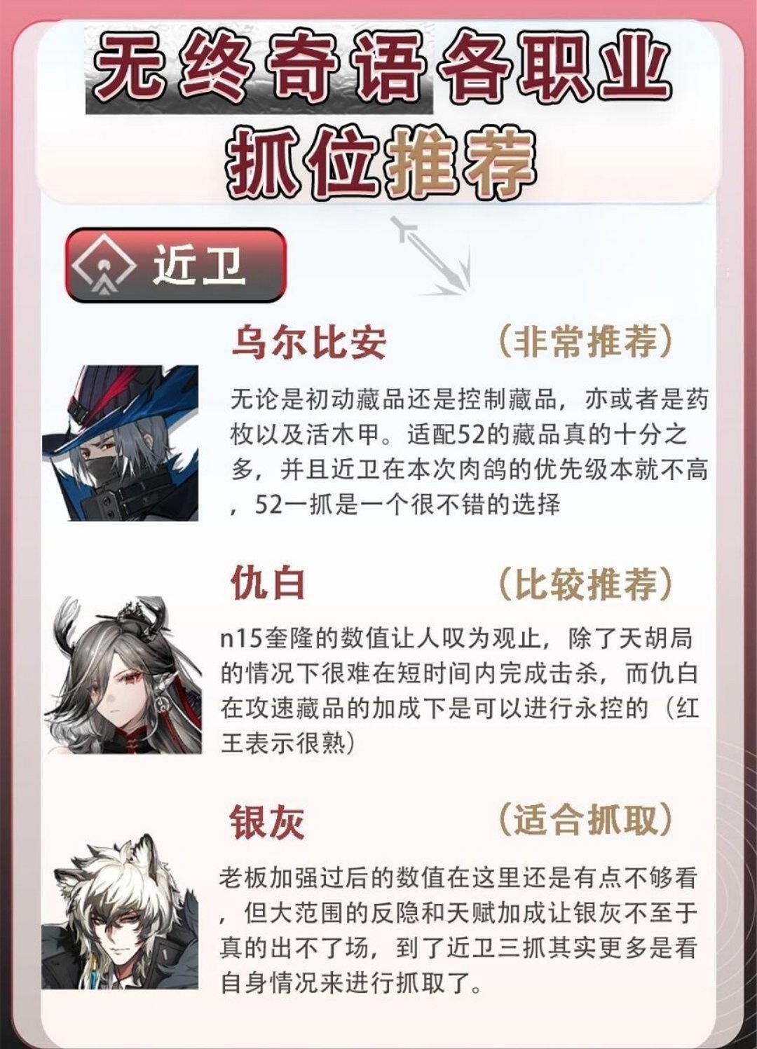 本次推薦僅代表個人意見,主要以n15難度爲標準,且側重於dlc關卡。非引戰無暗示並且本次推薦不代表任何其他團體個人意見,只是單純的個人抓位喜好,且本人認知範圍淺薄,又不是任何攻略組的成員,如果有其他意見歧義歡迎指出且默認是我的推薦有錯。本次推薦如有雷同純屬巧合。最後就是如果你們能點一下贊和關注的話我會萬分感謝並高興得今晚睡不着覺連打30把薩卡茲的無終奇語並保證不使用維什戴爾以保證目光的清澈。最後感謝大家的觀看!