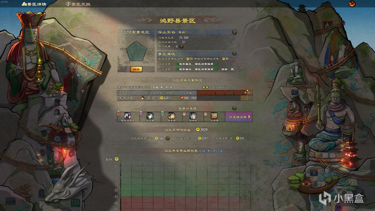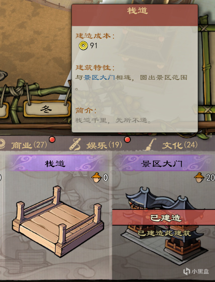 放置景区大门,用栈道圈出景区范围,景区范围确定之后,游戏左侧会出现景区功能,点击进去可以查看景区详情和景区天赋。