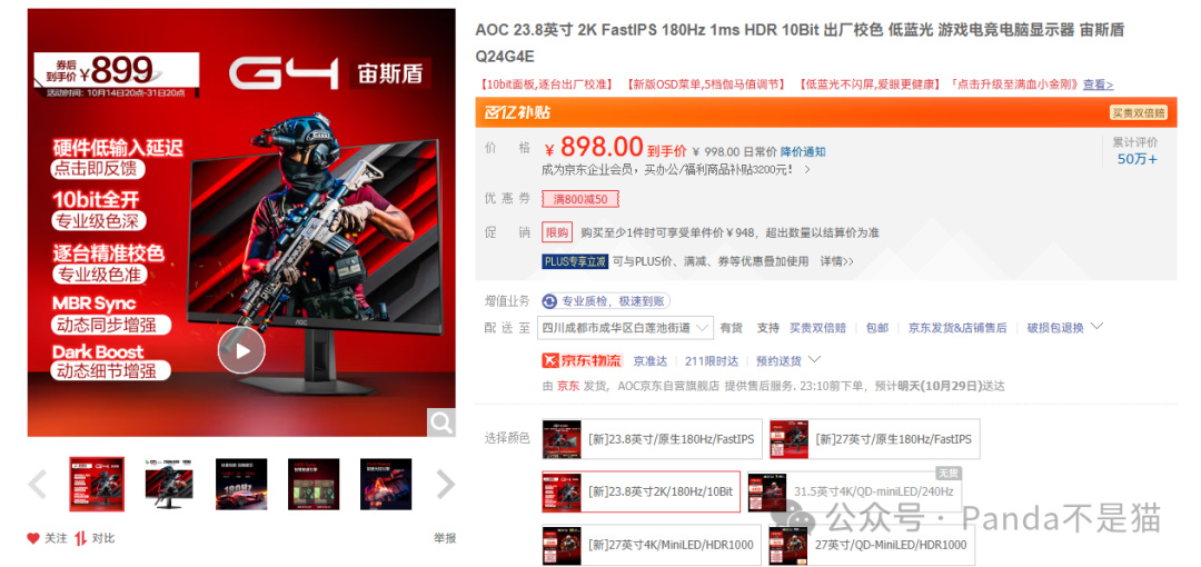 如果你喜歡小屏,那這裏熊貓推薦AOC的宙斯盾Q24G4E。2K分辨率下,作爲一款23.8英寸的屏幕能擁有更爲細膩的展示效果,刷新率也保持了180Hz的刷新率。價位會比HKC便宜那麼幾十塊,雙十一目前售價899。