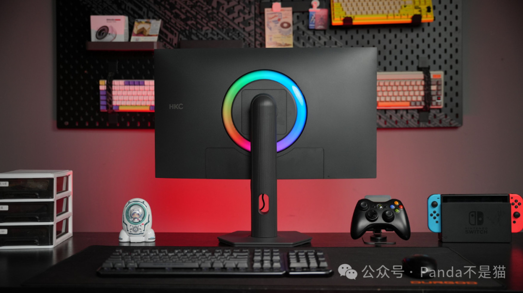此外,作爲HKC的MiniLED新產品線“星雲系列”的旗艦產品,G27M7Pro也是採用了新的外觀模具,更加扁平化的底座和人體工學支架設計,支持升降、俯仰、旋轉等多角度調節,背部的RGB炫彩氛圍燈效也爲整體視覺體驗增添了不少科技感。