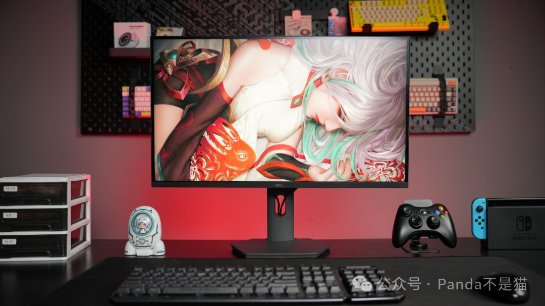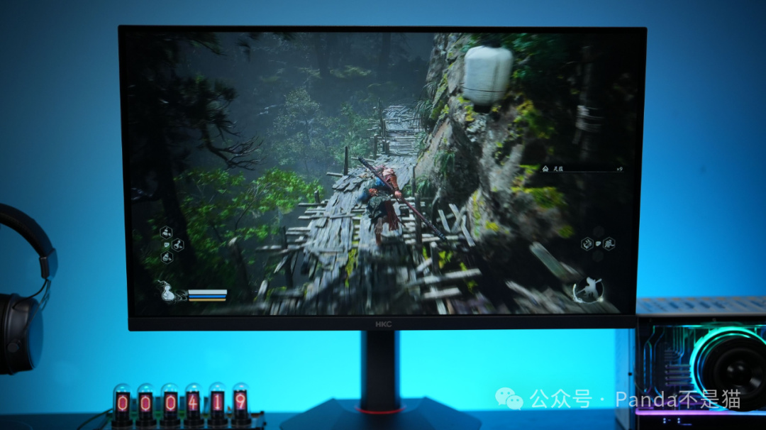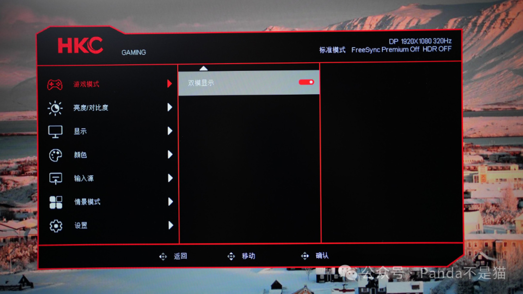 在MiniLED這邊,熊貓正好也是推薦HKC的新品(HKC最近也是太內捲了),同樣的也是27寸的顯示器,HKC G27M7Pro分辨率來到了4K,默認刷新率低一些是160Hz,但它依然是一款支持雙模顯示的電競顯示器,正如上面那款HKC G27H7Pro一樣,它也是能切換FHD320Hz模式來體驗更極致的流暢電競。不過作爲一臺MiniLED顯示器,刷新率自然不是他的重點,而是背光分區。