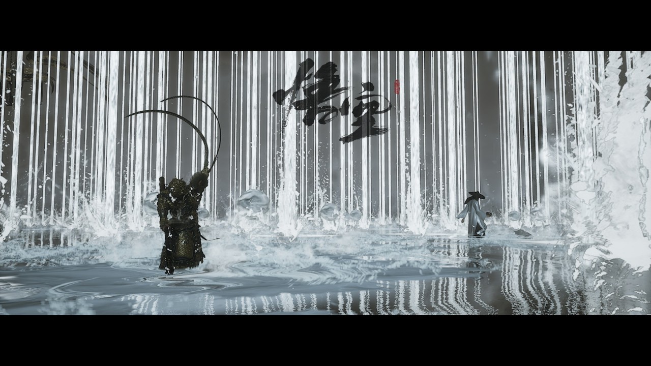 第二張我放棄了仰視帶來的畫面張力,黑色的猴哥和黑色斗笠的火焰山土地雙方都在白色的水箭中被凸顯出來,同時濺射的水花又擋住了八戒(不好意思但是八戒攻擊慾望確實太強了,得擋一下)