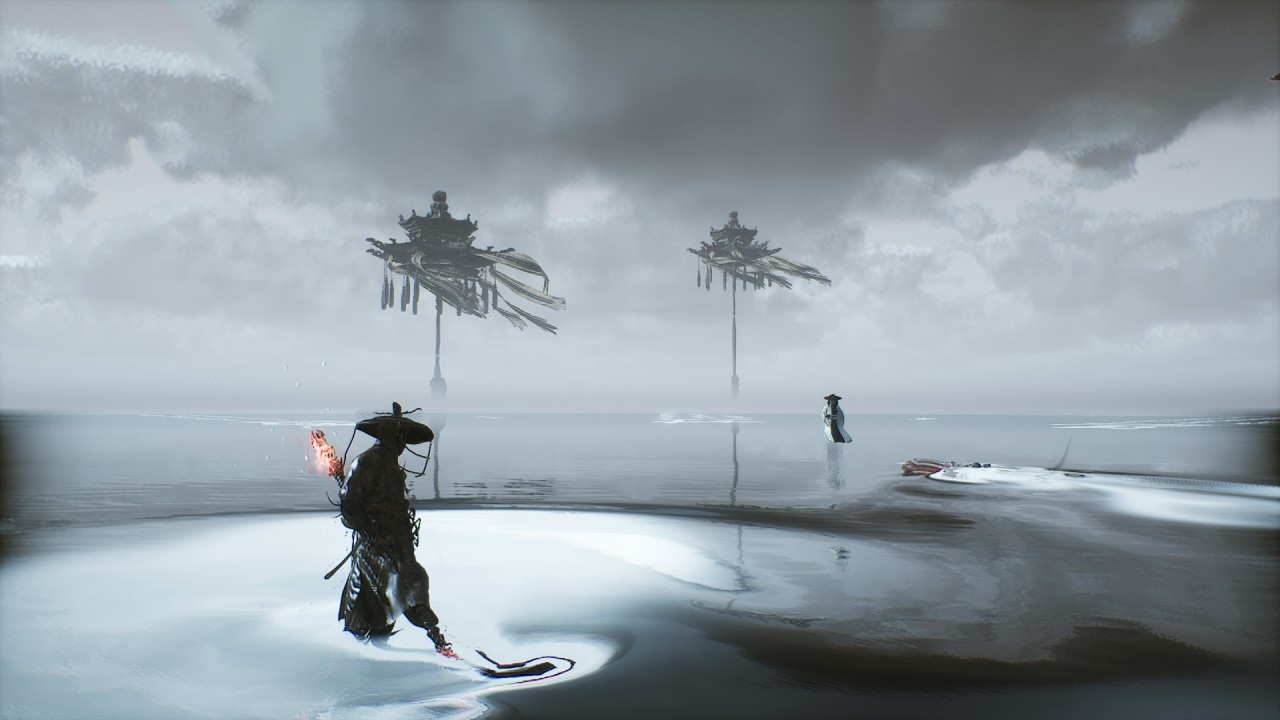 第一張無根水地面的黑白兩色形成了太極圖,加上背景裏飄動的風幡,大有一種山雨欲來的感覺。