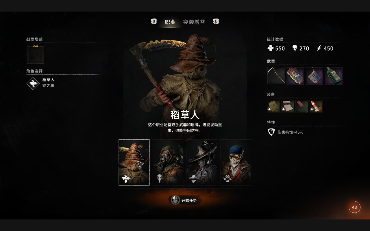 稻草人:配备双手武器和盾牌,进能发动重击,退能坚固防守。