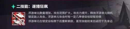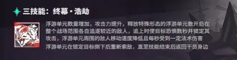 首先第一天赋,干员能随站场时间增长而获得不同攻击特效--伤害上限,沉默以及浮游单元数量增加。很明显,该天赋提升了她的输出质量、功能性与输出频率,使目标特殊能力短暂失效的沉默虽然在现在来看重要性有所降低,但遇到一些特殊情况仍然十分关键。
