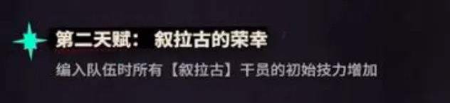 其次天赋二简简单单是一个阵营天赋,虽然“编入队伍即可生效”但很尴尬的一点是,目前很泛用的缄默德克萨斯并不属于叙拉古阵营,如果博士们想要吃到这个 buff,可以在队伍中带一个铃兰,既能提高荒芜拉普兰德输出上限,又能够触发其第二天赋。