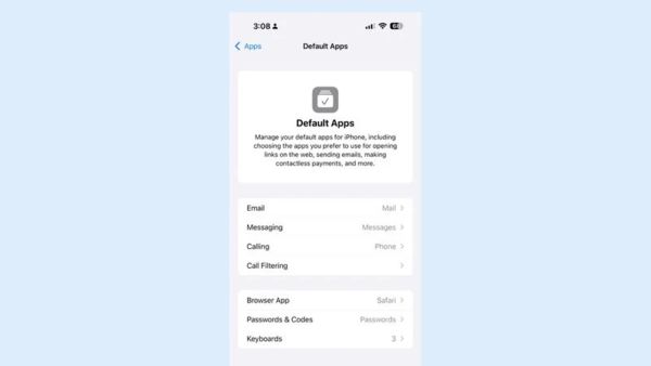 用戶可以設置默認的電子郵件、瀏覽器、密碼管理、過濾應用等。歐洲用戶甚至可以選擇刪除核心應用,如Safari、相機和照片應用。