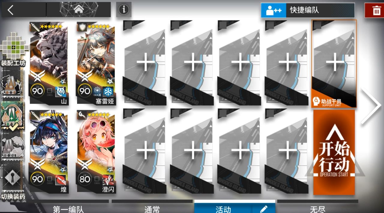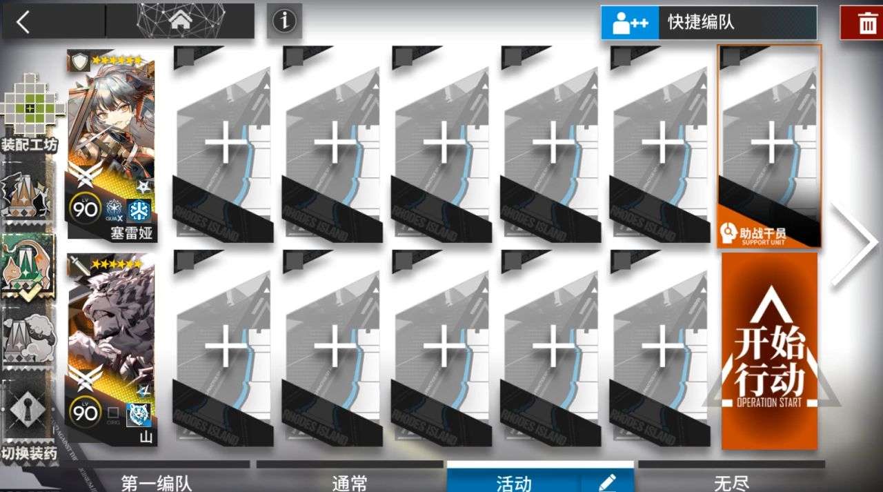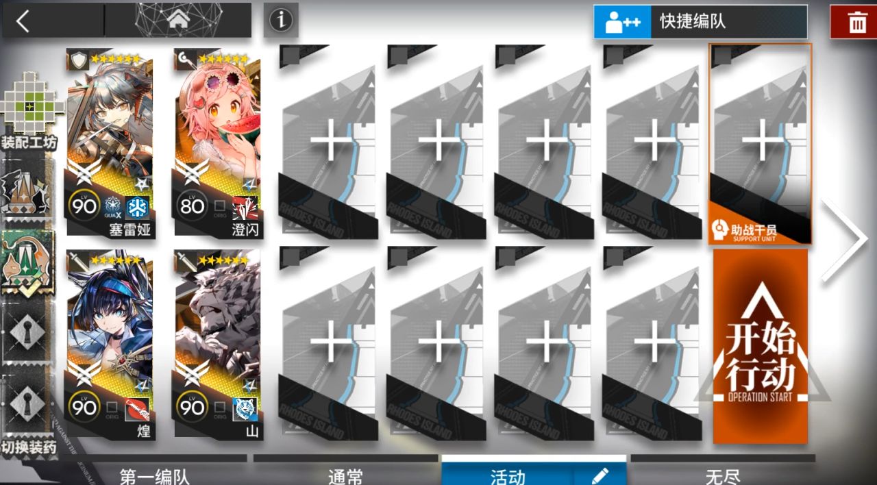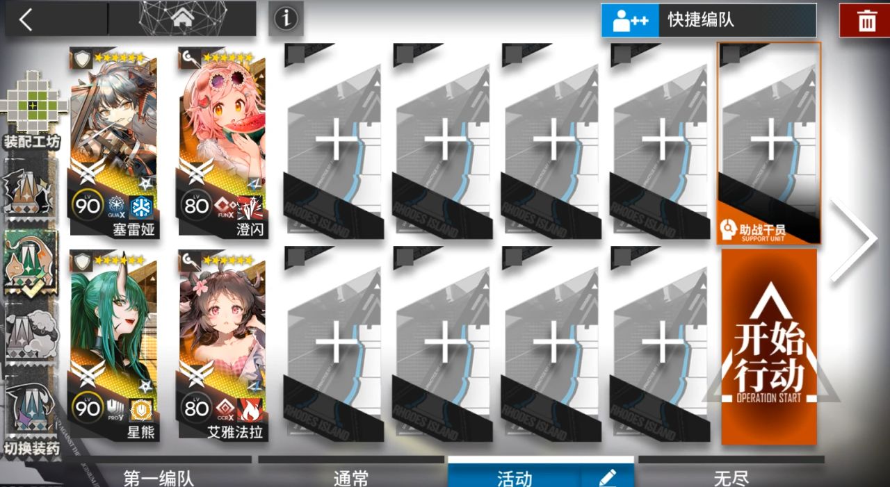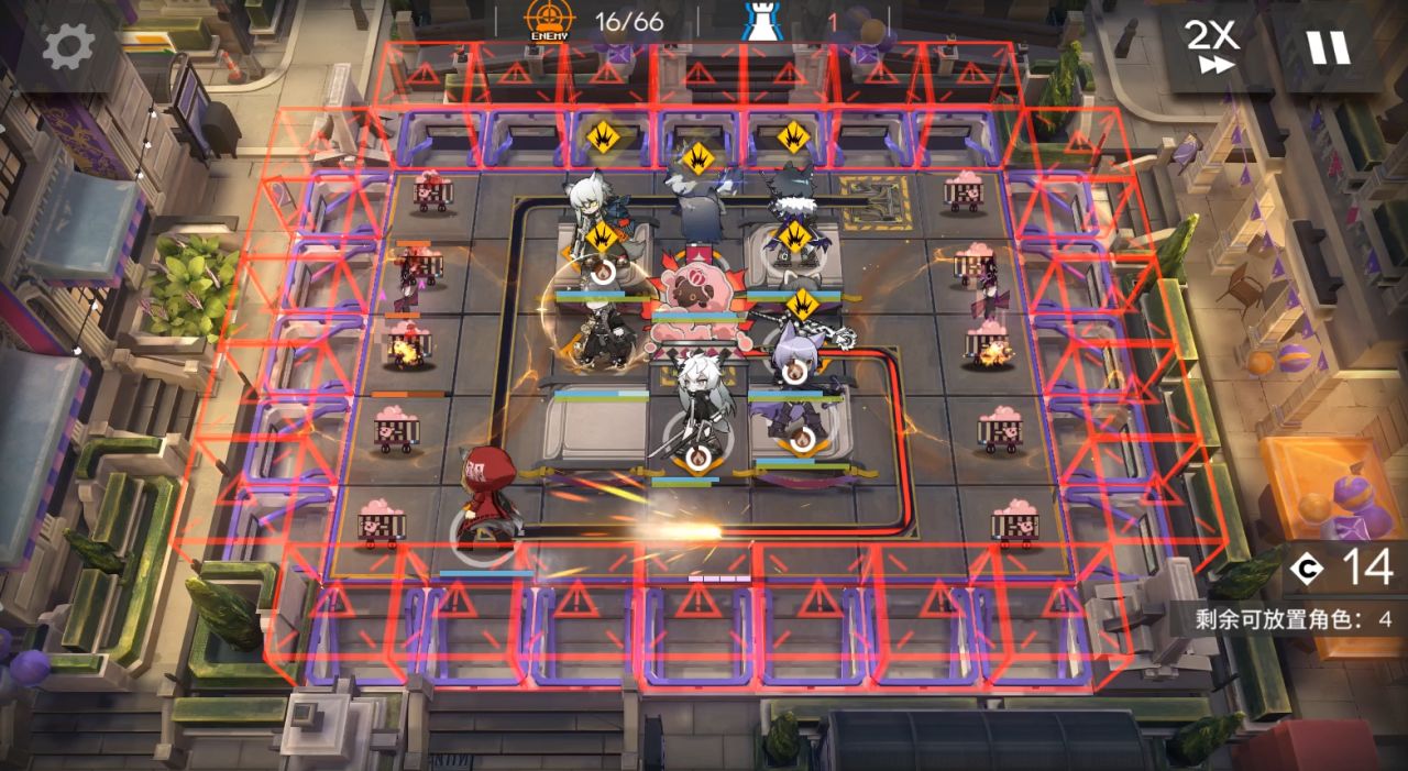 星熊带挡4模组,可换其他挡4。依次部署粉毛朝左,塞雷亚,小羊朝下,星熊朝左挂机。敌方左下右上共3个-1阻挡且需要挡3的怪,并且没有放烟花带减伤。要么挡4阻挡,要么可以元素或者真伤处理。法伤练度要高,减阻挡的怪会在烟花放的时候过来灭烟花,此时术士处理掉。