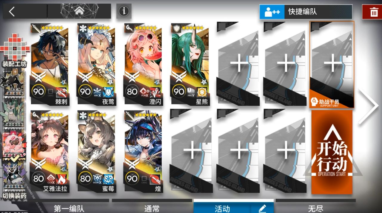 星熊可换其他开了挡4模组的重装。等怪来了再依次部署煌朝左,夜莺朝右,棘刺朝上,粉毛朝左,小羊朝右,蜜莓朝右,星熊朝上。打到最后会有2个需要挡3且召唤小怪的兵,星熊和煌各挡1个且星熊挡4挡小怪。