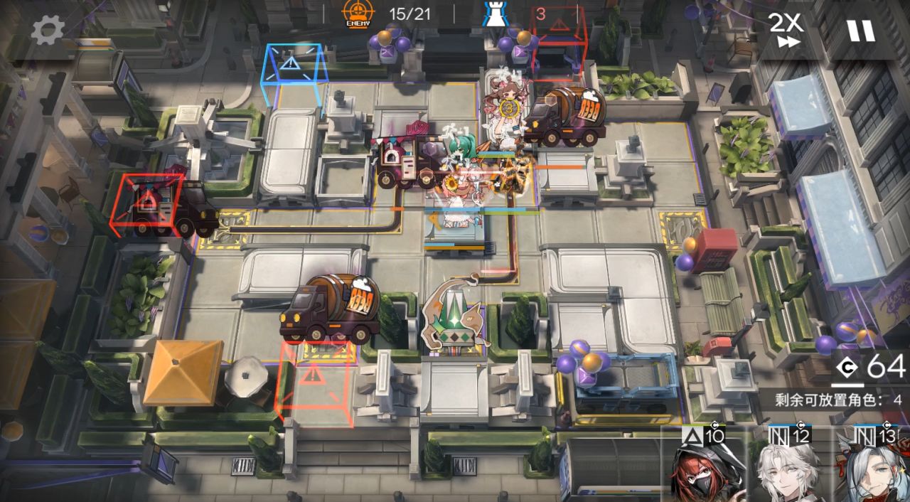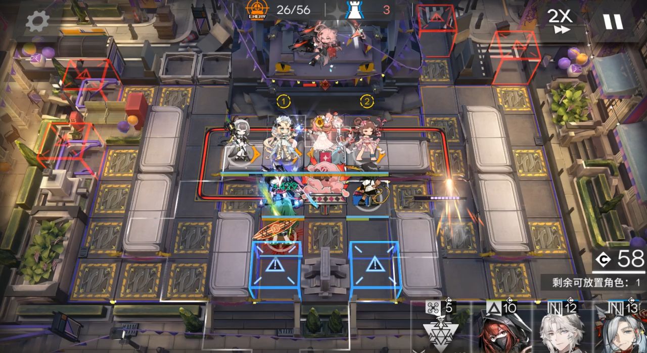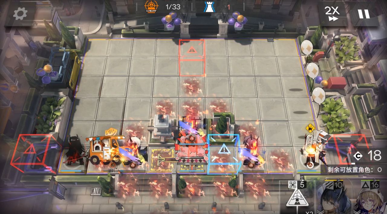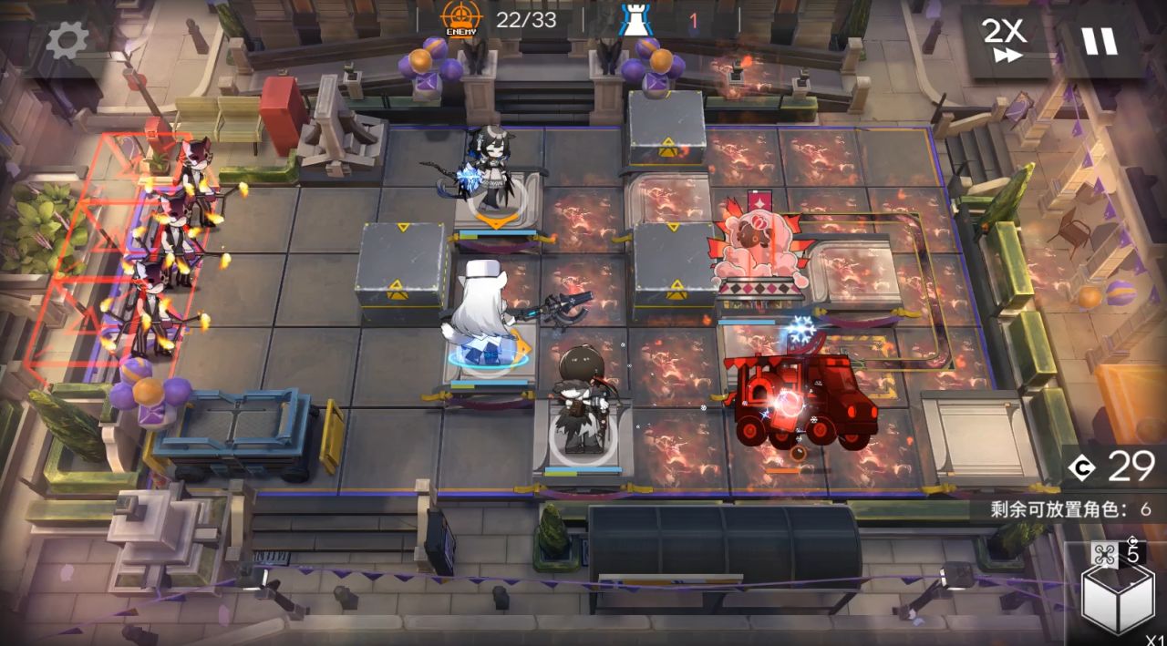 范围同上关。部署2个先锋伊内丝和迷图朝上,有怪或者气球来就开技能,刚好在烟花结束前能通关,不需要其他人操作。气球续费烟花时长。