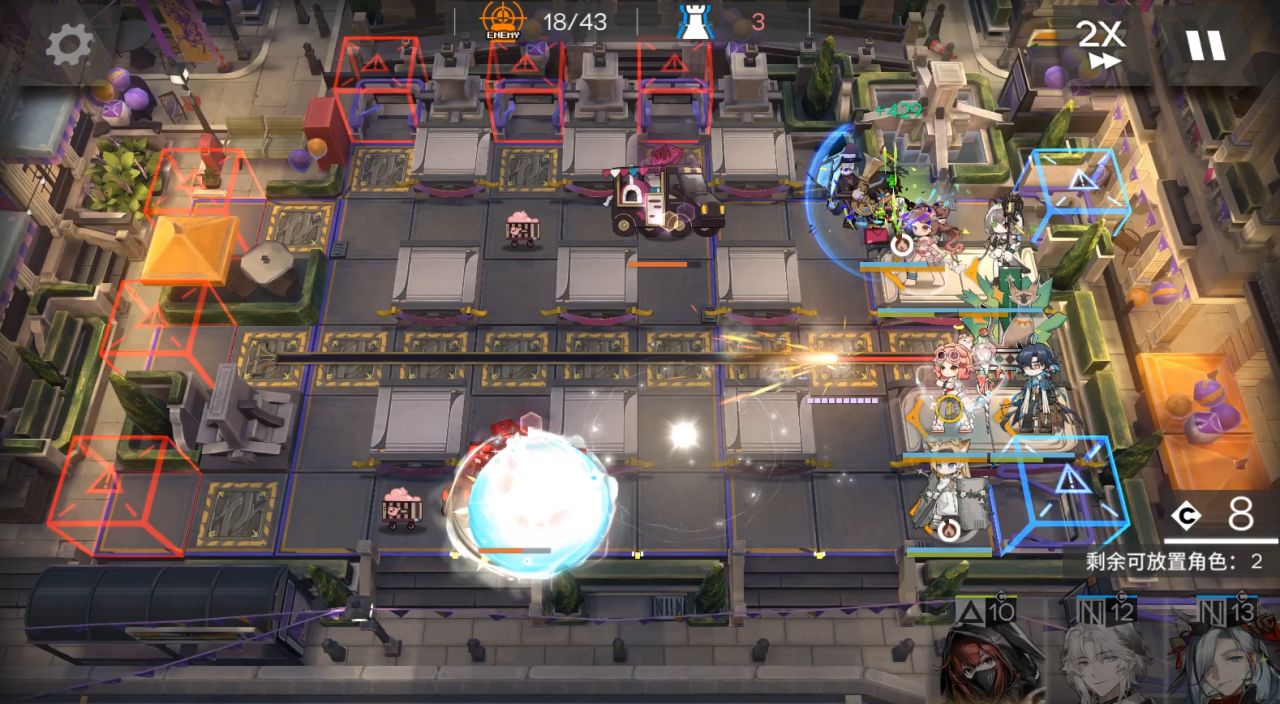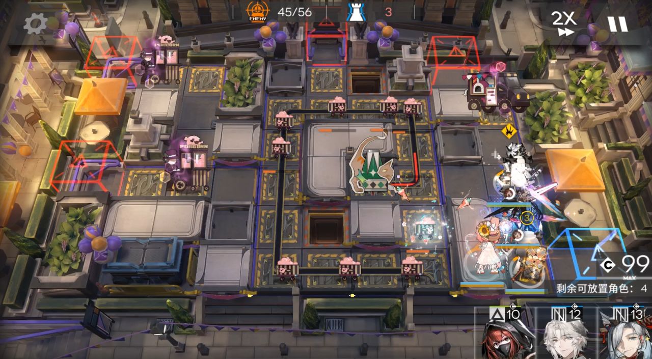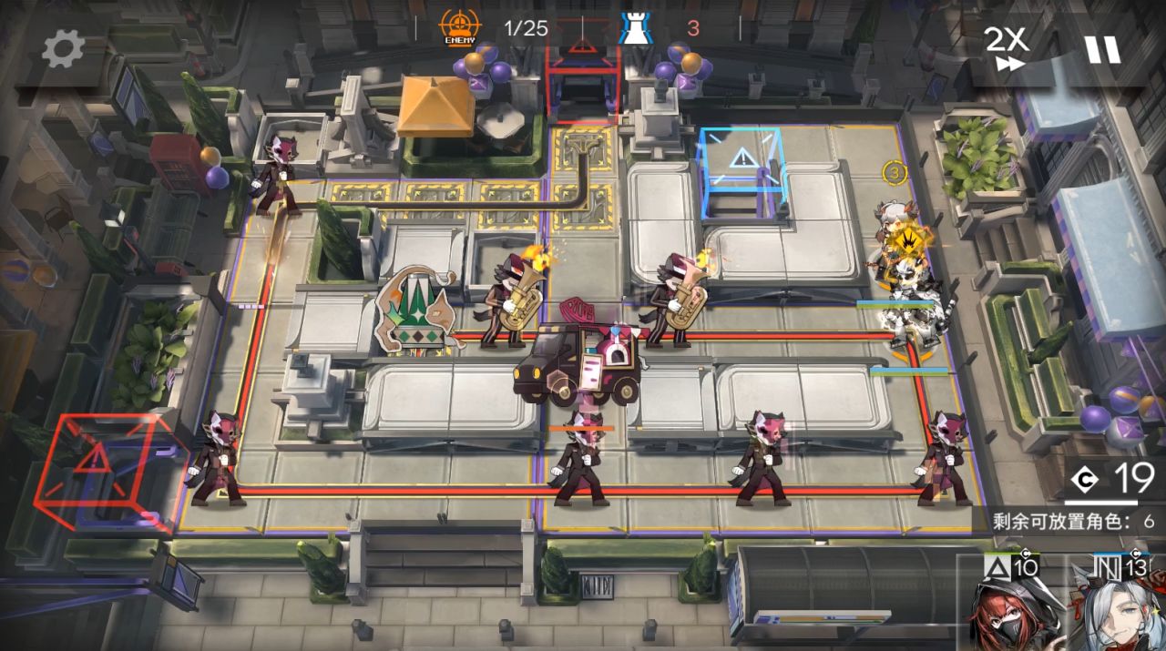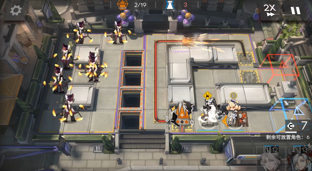 范围同上关。部署2个先锋伊内丝和迷图朝上,有怪或者气球来就开技能,刚好在烟花结束前能通关,不需要其他人操作。气球续费烟花时长。