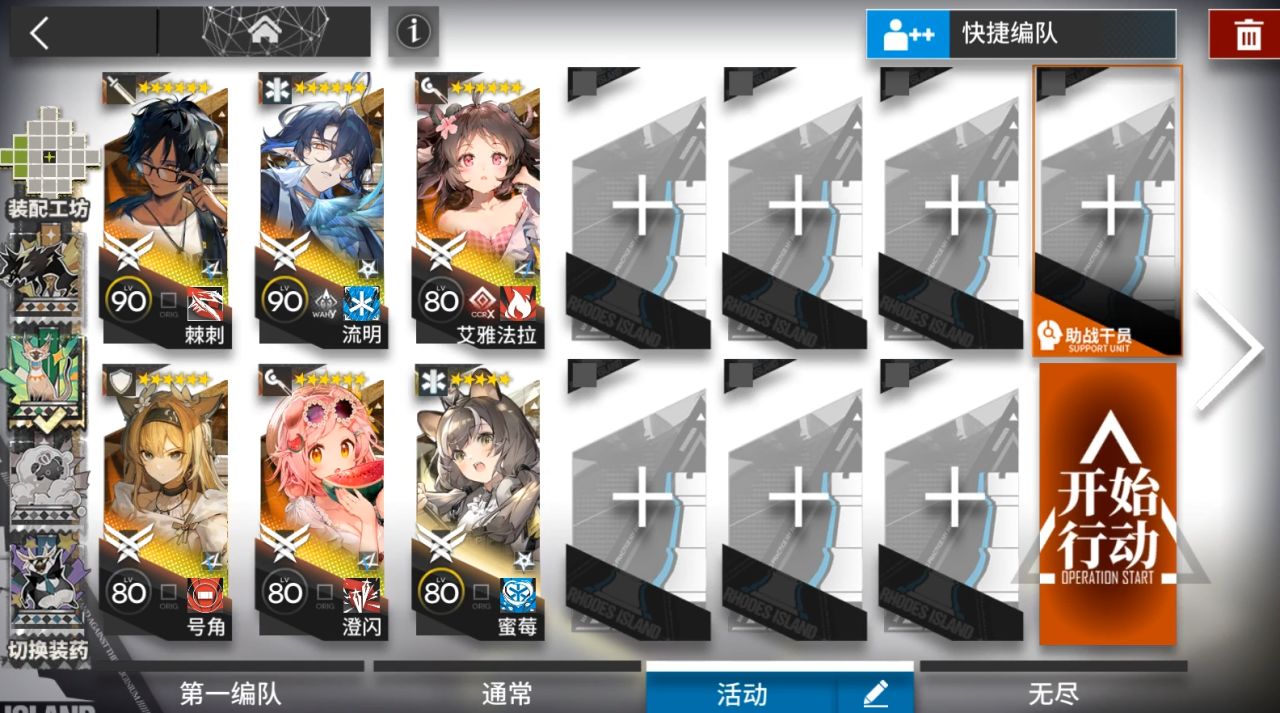 依次部署棘刺朝左,粉毛朝左,号角朝左,小羊朝左,蜜莓朝左,流明朝左挂机。