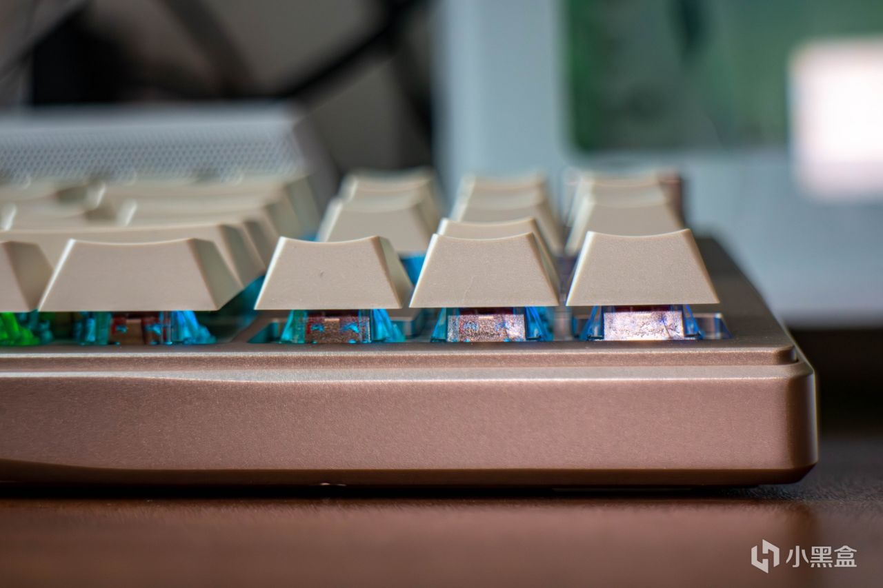 這個外觀整體是Cherry的風格,懸浮式設計,不過有點輕微下沉,也不算100%懸浮。我這把爲“時空金”配色,很有復古未來主義的氣息。