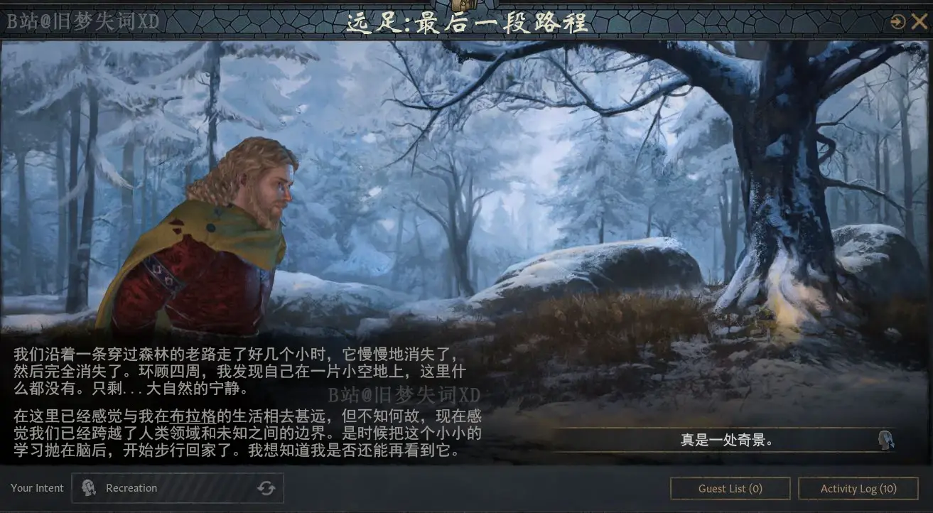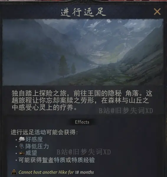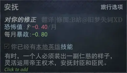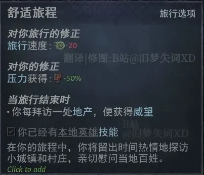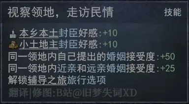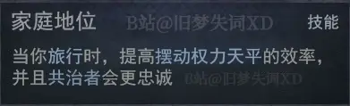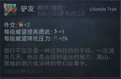 最后是关门技能点——旅游特质,该特质力图将整个技能树的主题统合起来。玩家的威望等级越高,减压越显著,同时还能获得勇武加成。也就是说玩家还是需要发挥自己的主观能动性,不然就算点的再快,只要等级不够高,获得的奖励也不会太多。