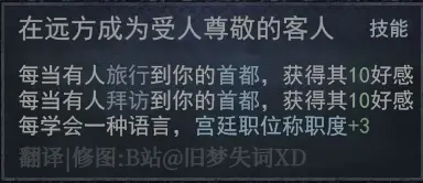 该技能点是语言主题的重点奖励,因为只要学会的语言够多,所有宫廷职位都会获得客观的称职度加成。