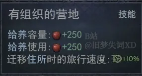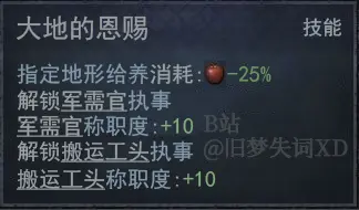 我们在设计该技能点时考虑是否延续视察的设计思路,尝试在穿越指定地形时不再需要担心给养消耗。开放与你的建筑无关的军需官和搬运工头职位意味着你将始终有有效的方法来处理补给。